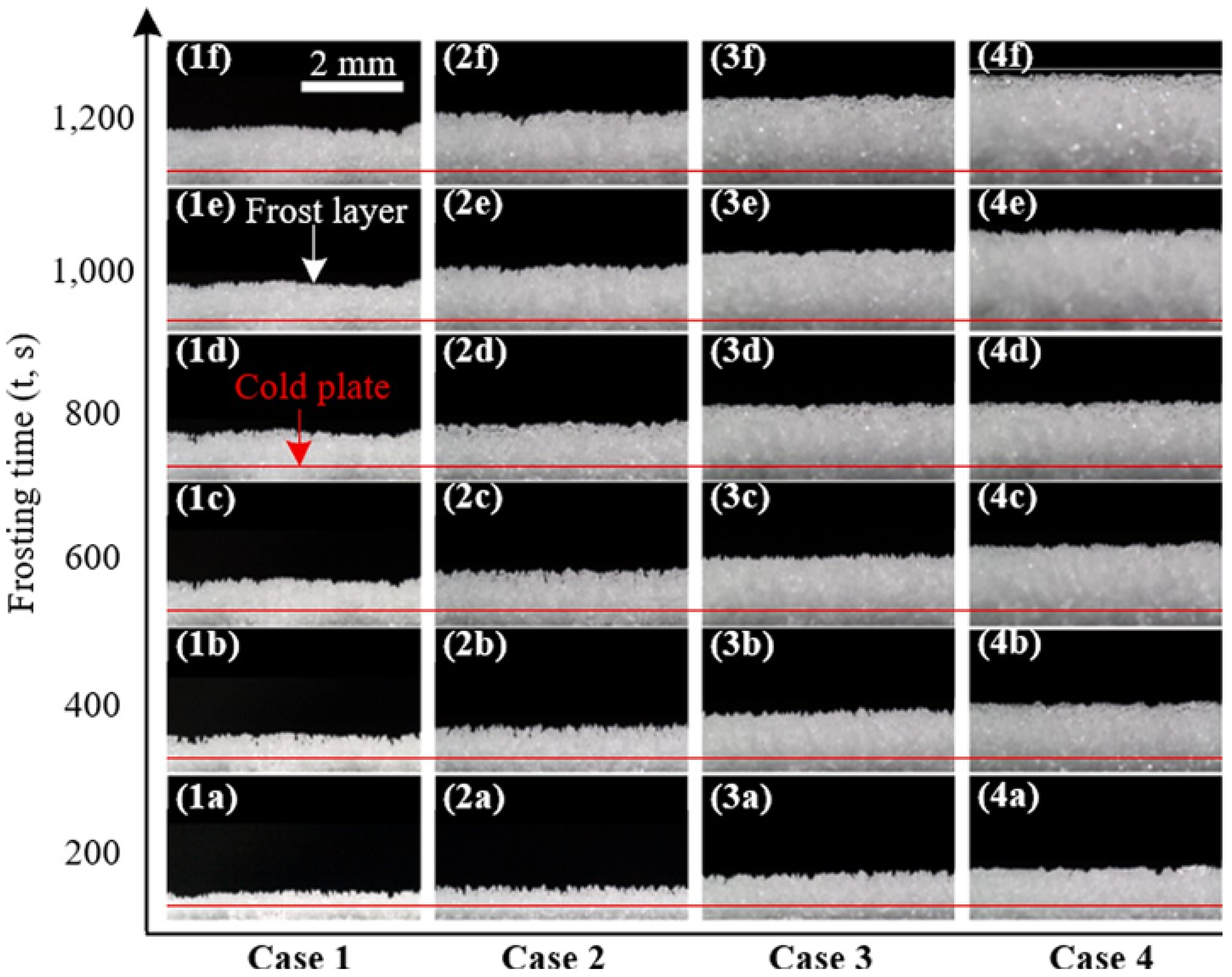 - Song, M.J.; Shangwen, L.; Hosseini, S.H.; Luo, X.Y.; Wang, Z.H. An experimental study on the effect of horizontal cold plate surface temperature on frosting characteristics under natural convection. Appl. Therm. Eng. 2022, 211, 118416. [Google Scholar] [CrossRef]