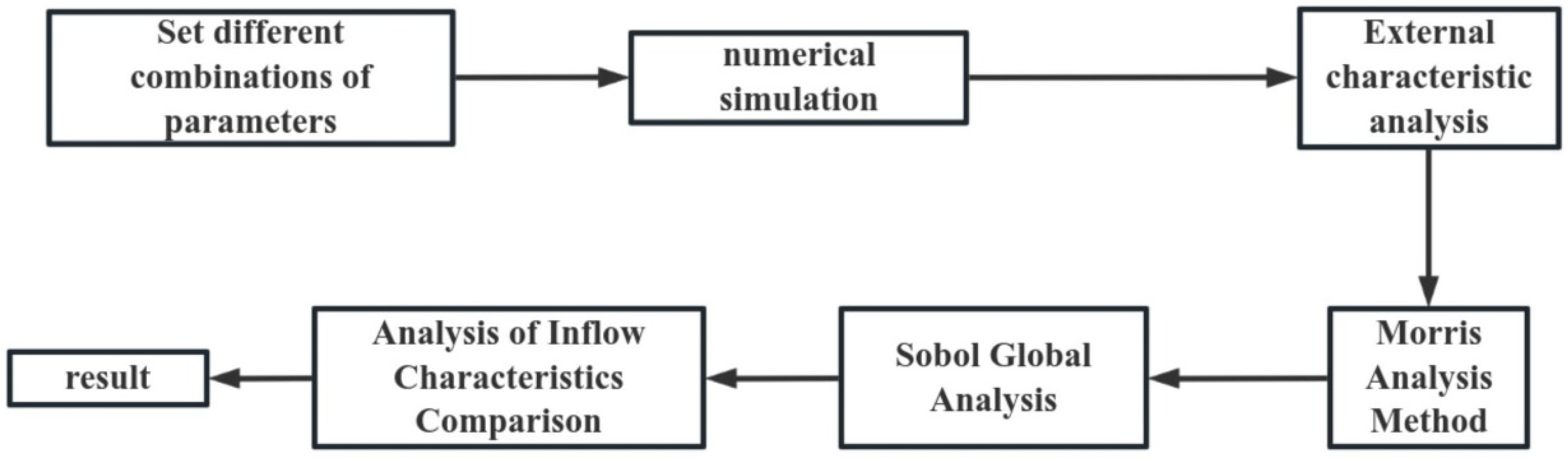 Figure 12, the dashed lines denote the average values of all structural parameters for each sensitivity index. However, the Morris method mainly provides qualitative screening results and cannot quantitatively evaluate the relative contributions of individual parameters or their interaction effects. Therefore, Sobol global sensitivity analysis is further conducted to quantify the individual and coupled effects of these three dominant parameters. Considering the high computational cost of Sobol analysis, only these key geometric variables are selected for further investigation. To improve the accuracy and reliability of the Sobol analysis, additional samples are generated by increasing the sampling density and narrowing the parameter intervals of the impeller outer diameter, axial length, and blade wrap angle. The final variation ranges are set to 163–211 mm for the impeller outer diameter, 40–64 mm for the axial length, and 108–132° for the blade wrap angle. Numerical simulations are then performed for all sampled configurations, and the corresponding external performance data are collected for subsequent sensitivity analysis.