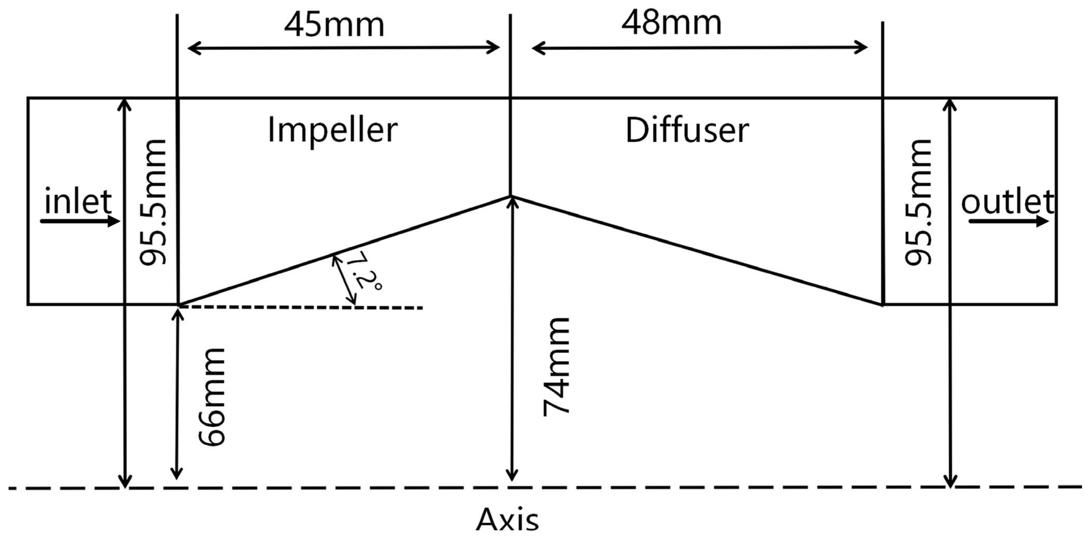 Based on cross-comparison of all cases, the maximum efficiency of 37.6% is achieved for the parameter combination D0 = 186 mm, Ls = 50 mm, φ = 140°, β1s = 5.6°, β1h = 7.5°, Z = 6, δ = 0.3, αh = 7.5°, and ν = 0.7. The maximum pressure rise of 0.154 Mpa is obtained for a similar configuration with D0 = 191 mm, Ls = 56 mm, and φ = 140°.