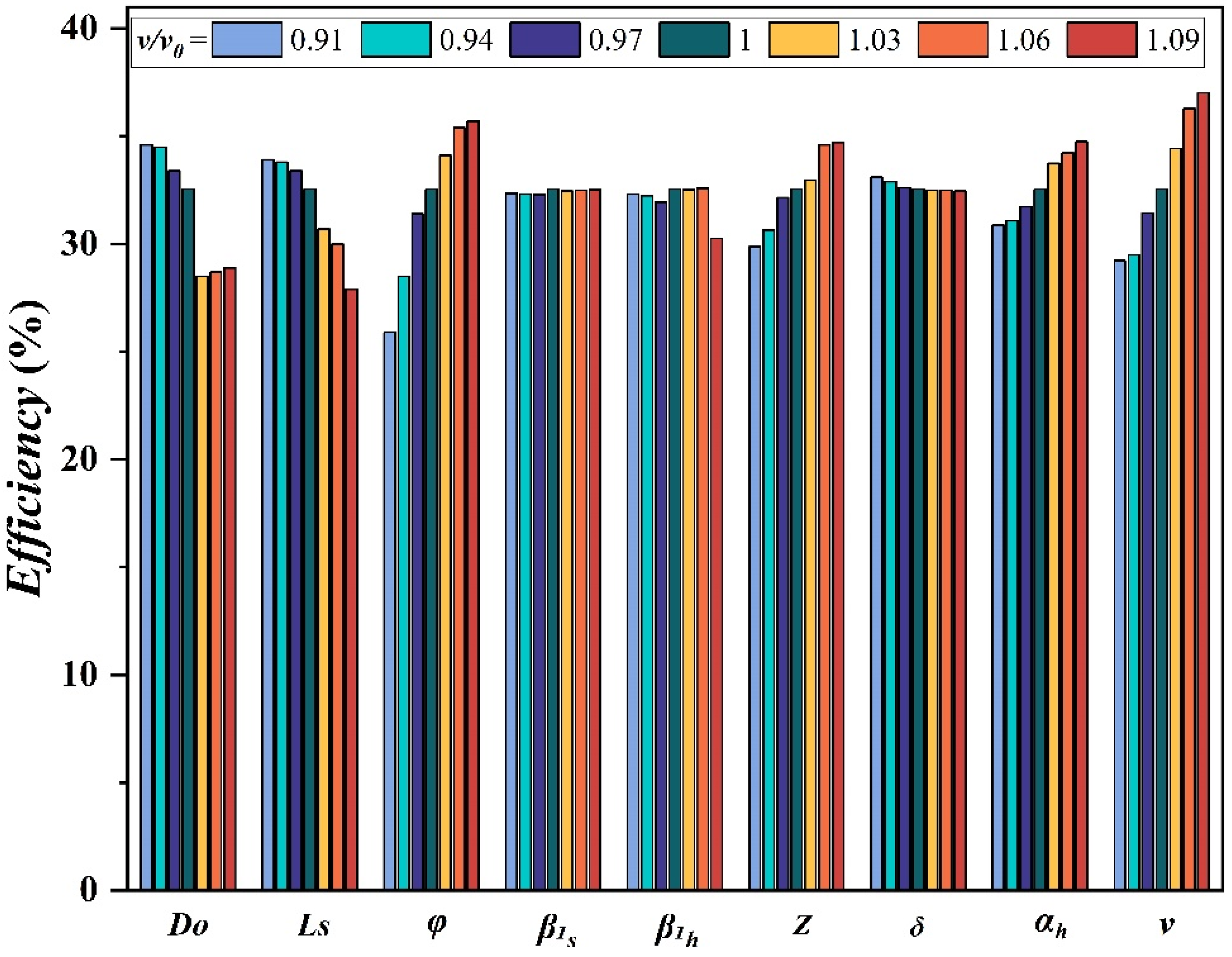 Figure 10 present the bar charts illustrating the effects of the dimensionless values of nine key impeller geometric parameters on pump efficiency and pressure rise (Pout-Pin), respectively. The results indicate that both efficiency and pressure rise exhibit pronounced nonlinear responses to parameter variations within the range of 0.91–1.09. For most parameters, either efficiency or pressure rise reaches an extremum at the dimensionless value of 1.00 (the baseline design), suggesting that this value represents a critical balance point.