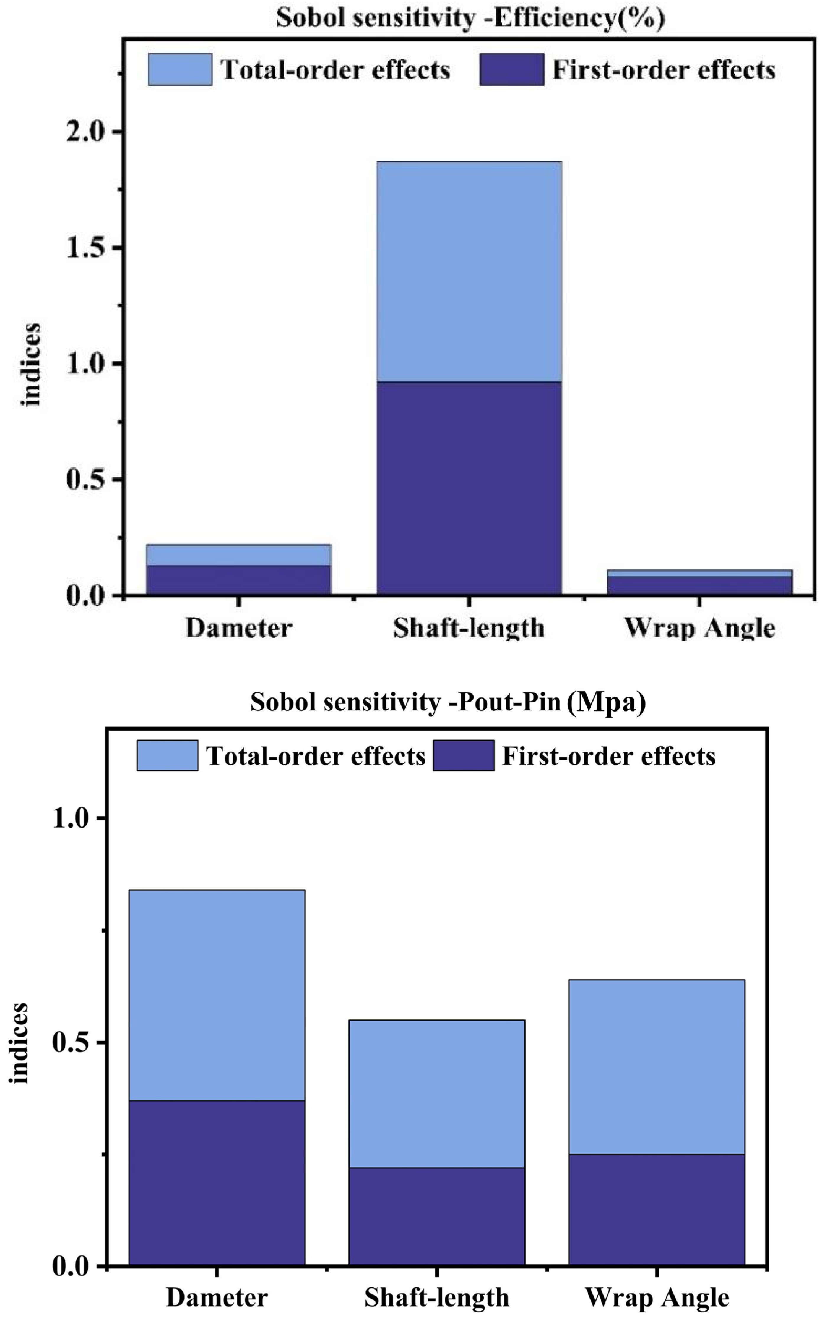 To further investigate parameter interaction effects, Sobol global sensitivity analysis is employed to quantitatively evaluate the influence of individual parameters and their interactions on pressure rise and efficiency through the accurate calculation of first-order and total-effect indices.