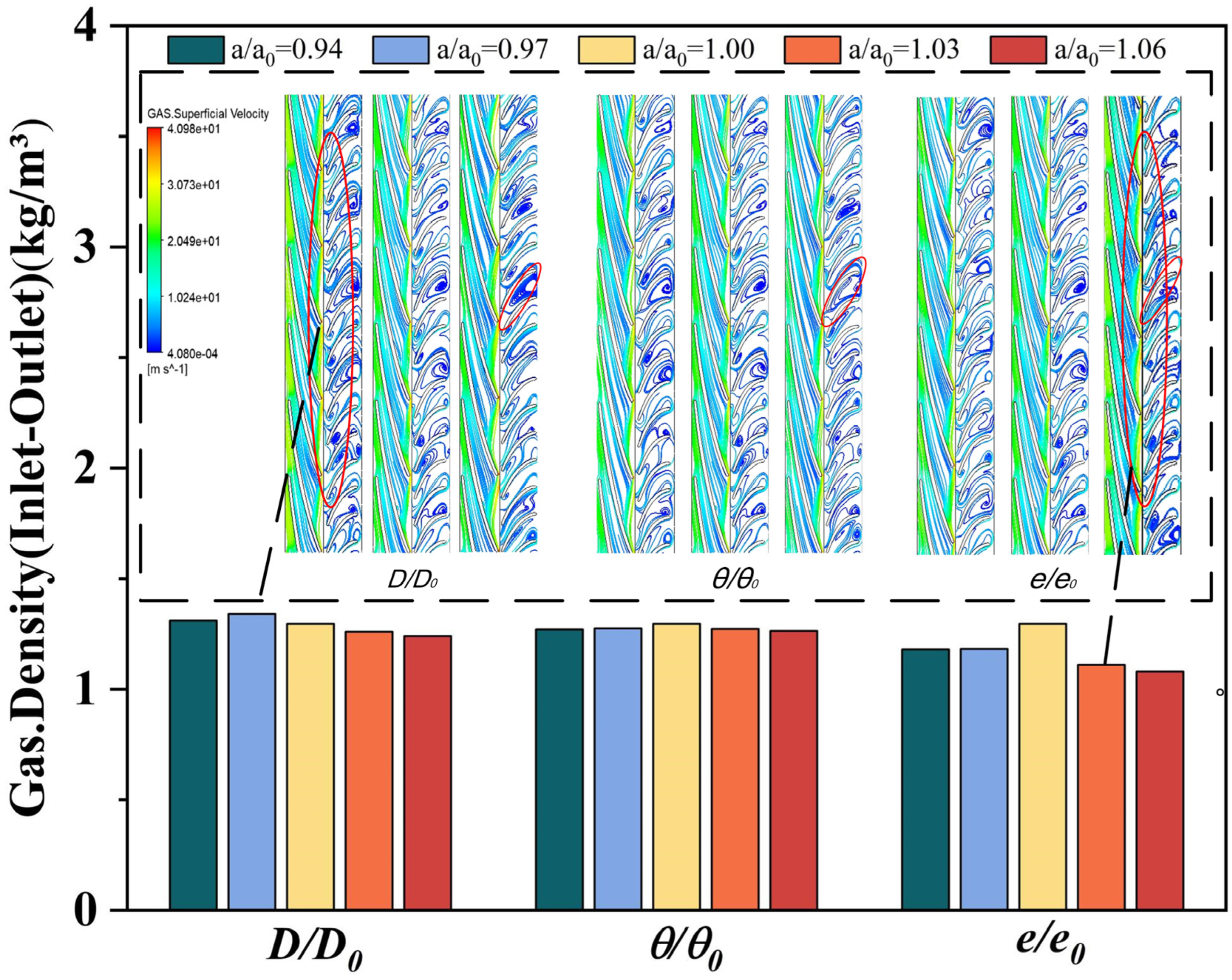 Figure 16 illustrates the gas streamlines at 0.5 blade height and the bar charts of inlet–outlet gas density difference (Δρ) under different geometric configurations. The results reveal a nonlinear response of Δρ to variations in the three structural parameters, namely