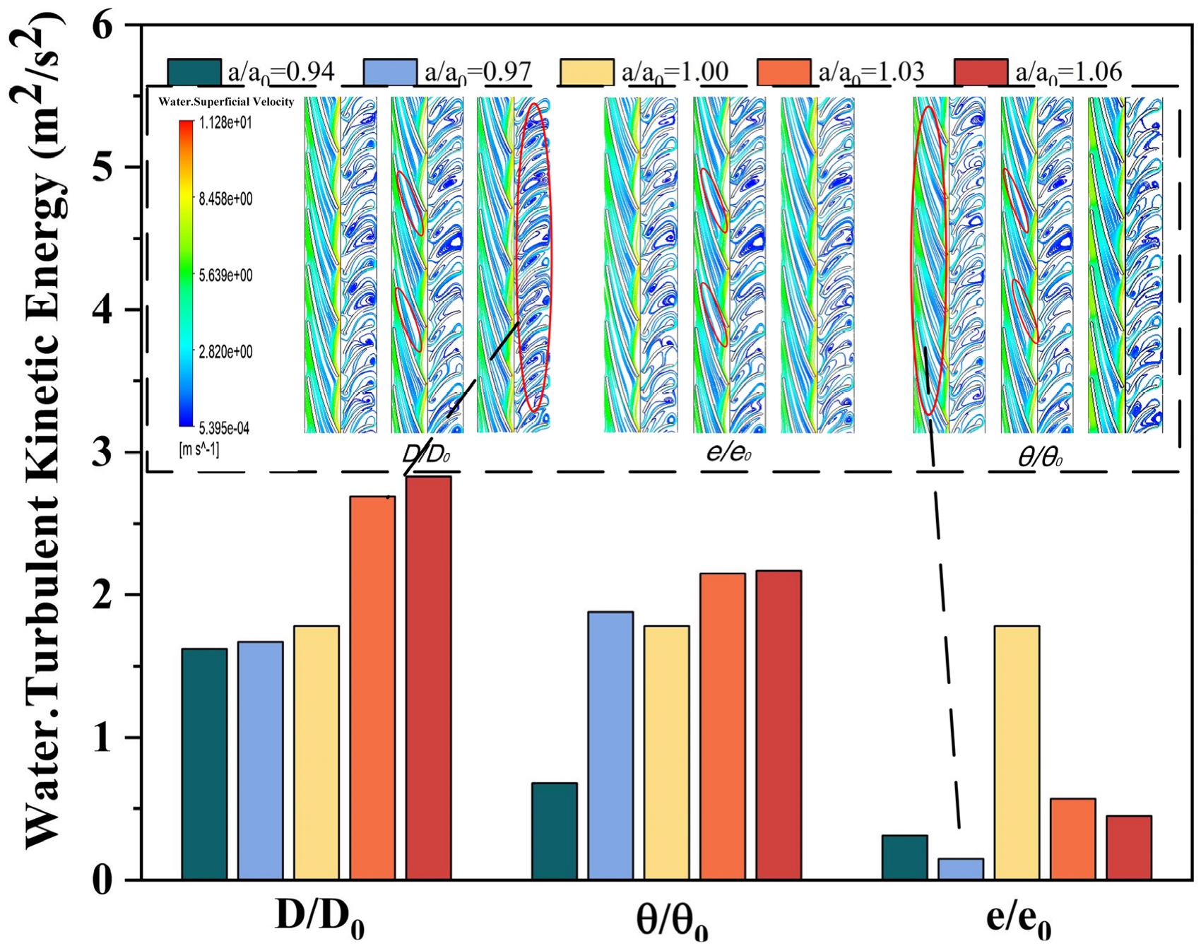 As shown in the figure, the liquid-phase streamlines inside the impeller are relatively uniform, with high inlet velocities. Within the impeller passages, the liquid velocity first decreases and then increases, and the recirculation region near the impeller outlet is noticeably smaller than that observed for the gas phase. In addition, the distribution characteristics of liquid-phase streamlines differ significantly from those of the gas phase. Specifically, blank or low-velocity regions in the liquid-phase streamlines are mainly observed under the baseline design configuration, whereas such regions are almost absent under reduced or enlarged geometric conditions. In the diffuser region, the number of vortices formed by liquid-phase streamlines is substantially smaller than that of gas-phase vortices. Under the baseline design condition, liquid-phase vortices exhibit the largest characteristic diameter but the smallest number, indicating that the liquid phase shows better adaptability to geometric variations than the gas phase. Among the three parameters, variations in impeller outer diameter exert the strongest influence on liquid-phase TKE within the impeller, while variations in blade wrap angle have the weakest effect. Comparisons of different impeller outer diameters reveal that larger diameters lead to a sharp increase in turbulent kinetic energy, suggesting that excessive outer diameter intensifies gas–liquid separation and secondary flow phenomena. As the diameter decreases, the reduction in TKE becomes relatively gradual. For axial length variations, extremely low TKE values are observed at small axial lengths (e/e0 = 0.96), whereas TKE remains nearly unchanged when e/e0 ≥ 0.97. This indicates that shorter axial lengths effectively suppress the generation of turbulent kinetic energy, which is consistent with the fact that a reduced transport distance limits gas–liquid separation within the impeller. With respect to blade wrap angle, both large and small wrap angles contribute to a reduction in TKE, with smaller wrap angles exhibiting a more pronounced effect.