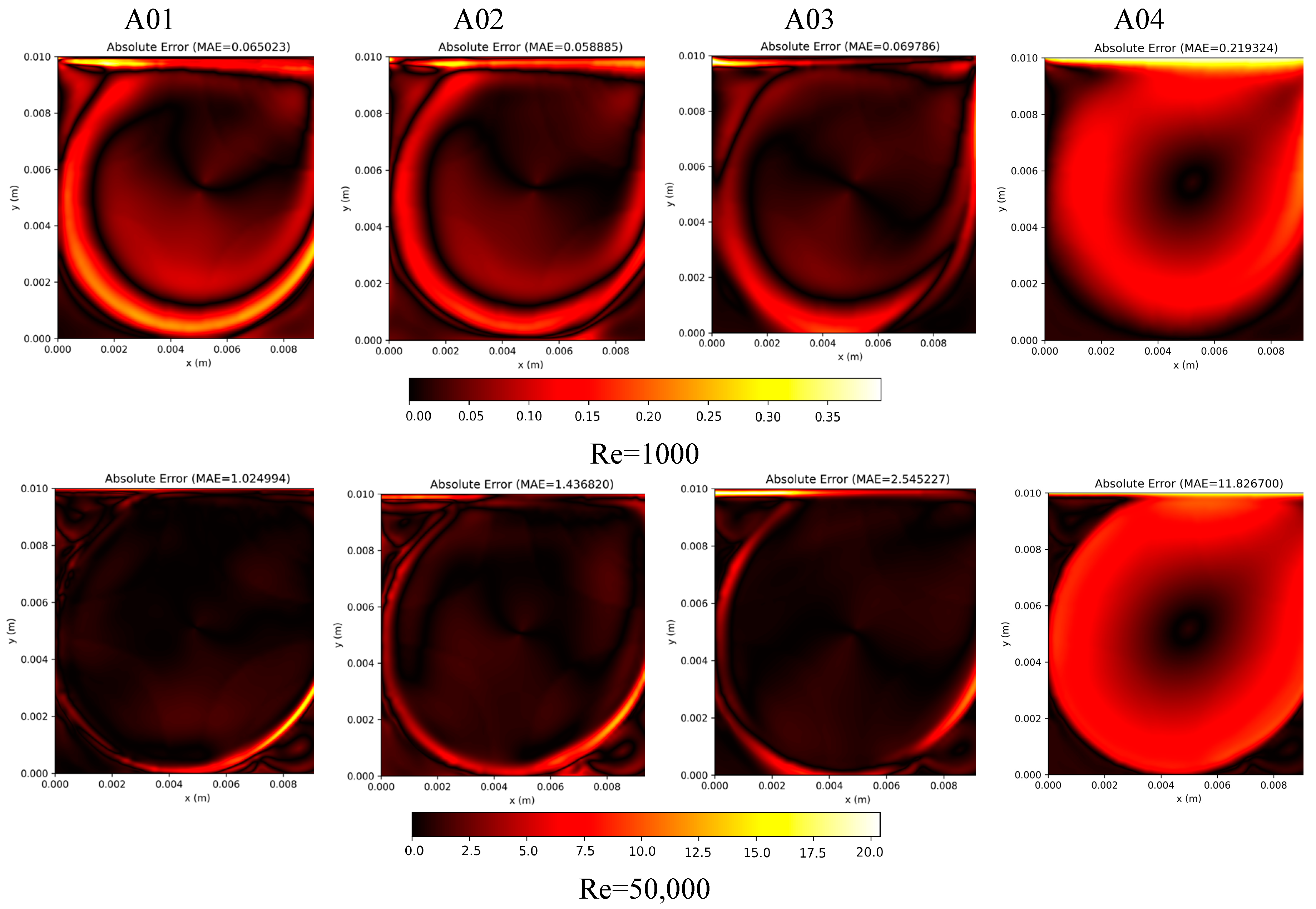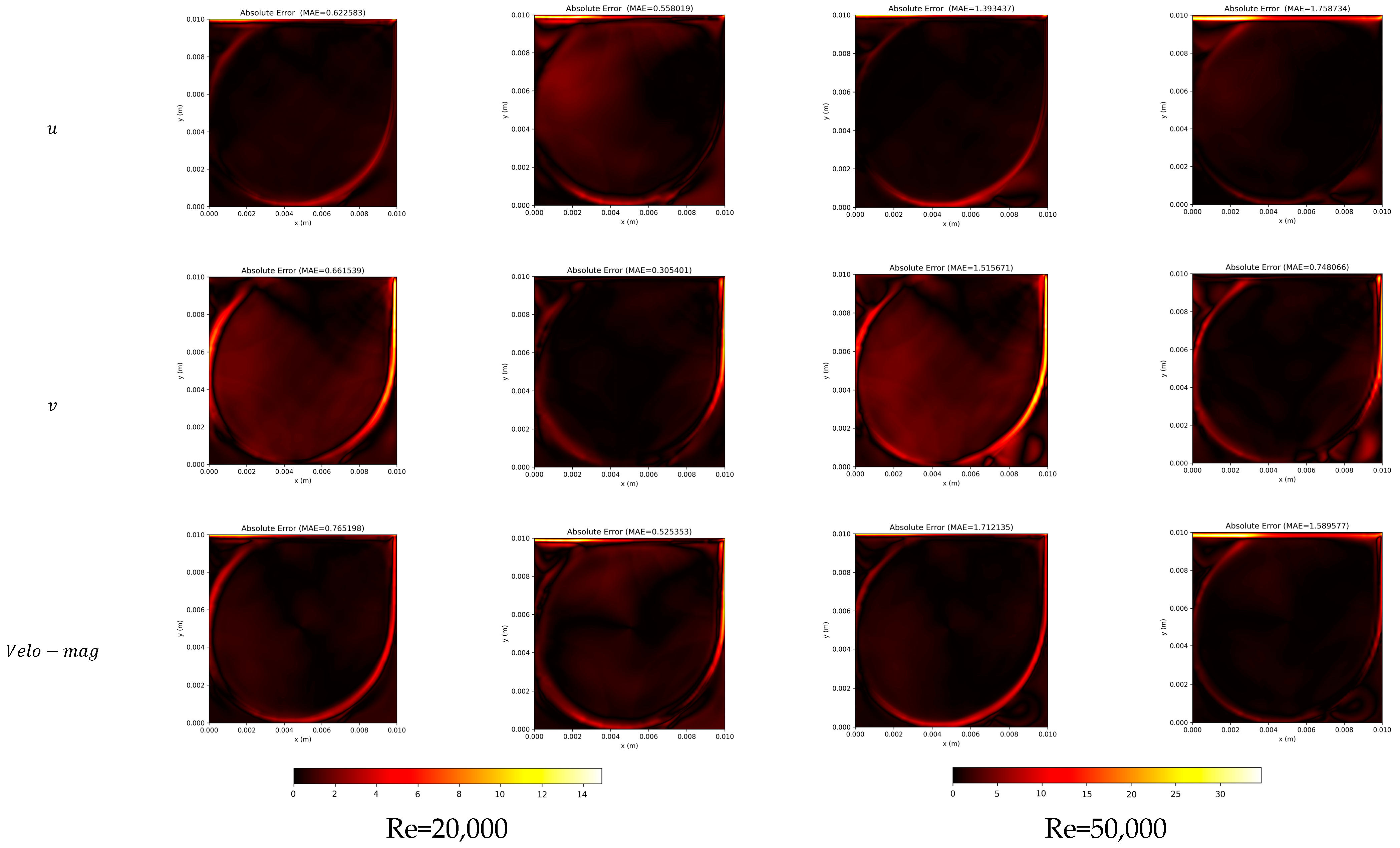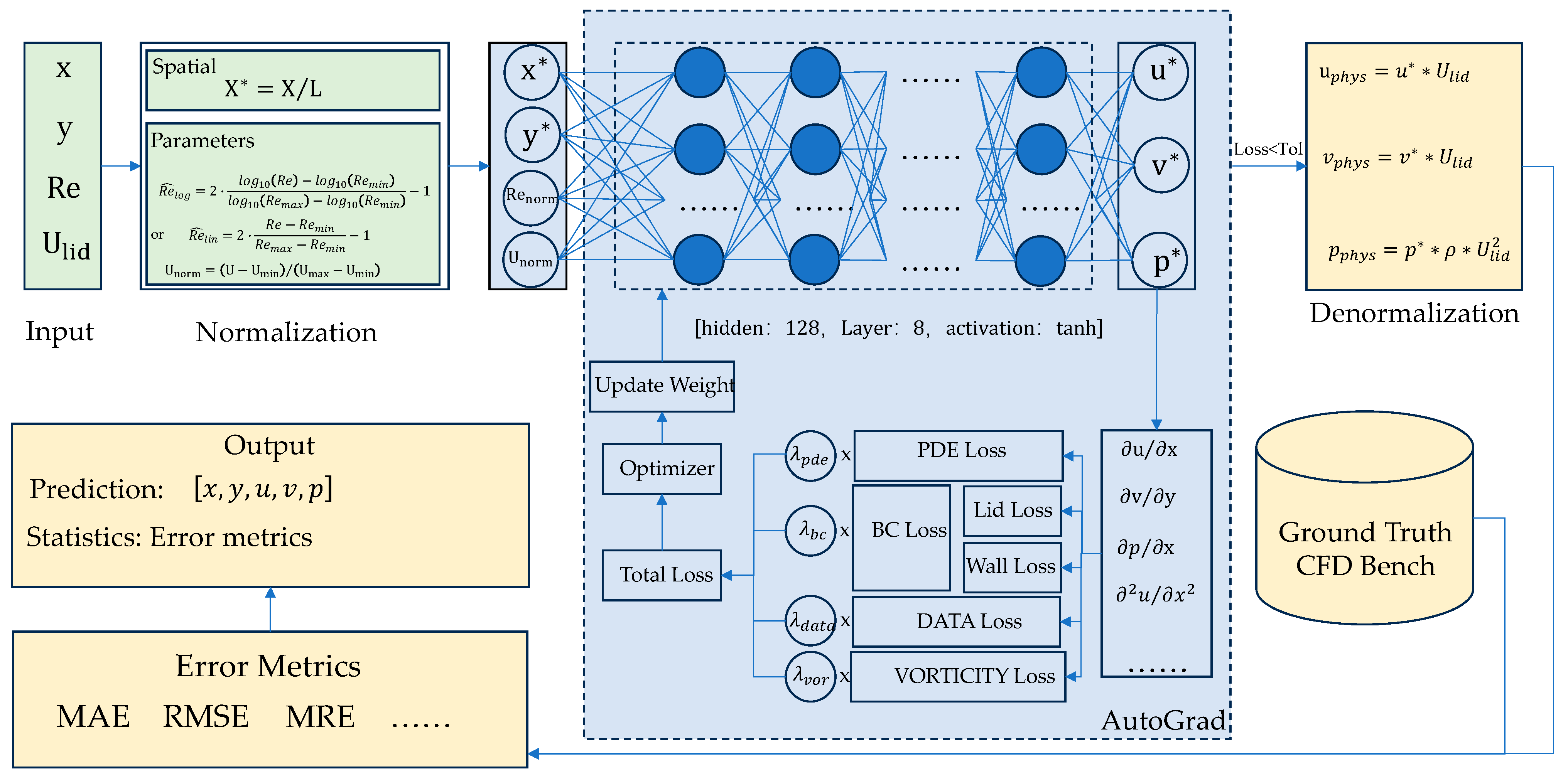 - Luo, Y.; Chen, Y.; Zhang, Z. CFDBench: A Comprehensive Benchmark for Machine Learning Methods in Fluid Dynamics. arXiv 2024. [Google Scholar] [CrossRef]