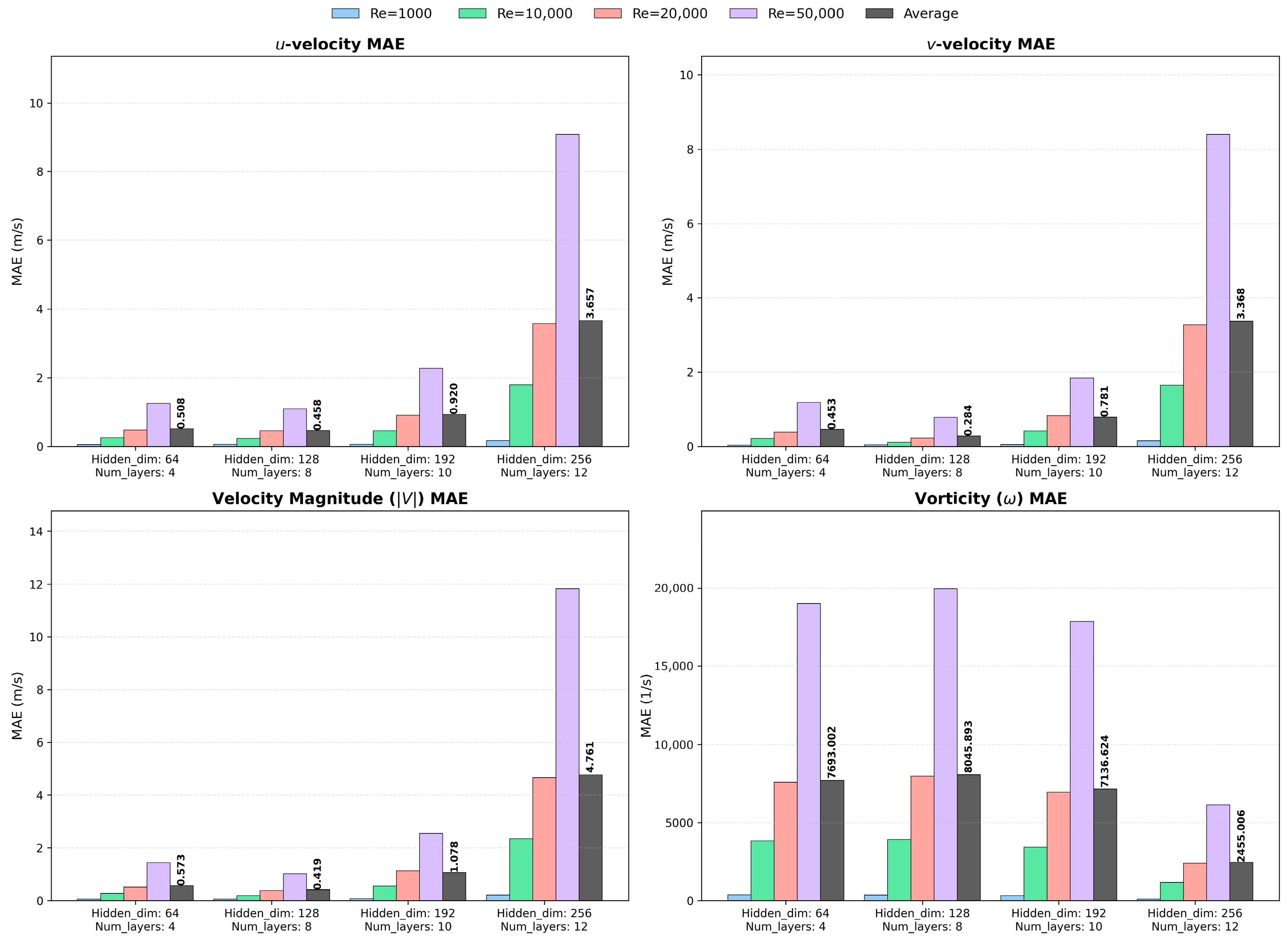 | D | Normalization Strategy | Reynolds embedding; input scaling | linear, , ; scaling: 50 k/100 k/ ∞ | Improve conditioning for multi-regime learning |
