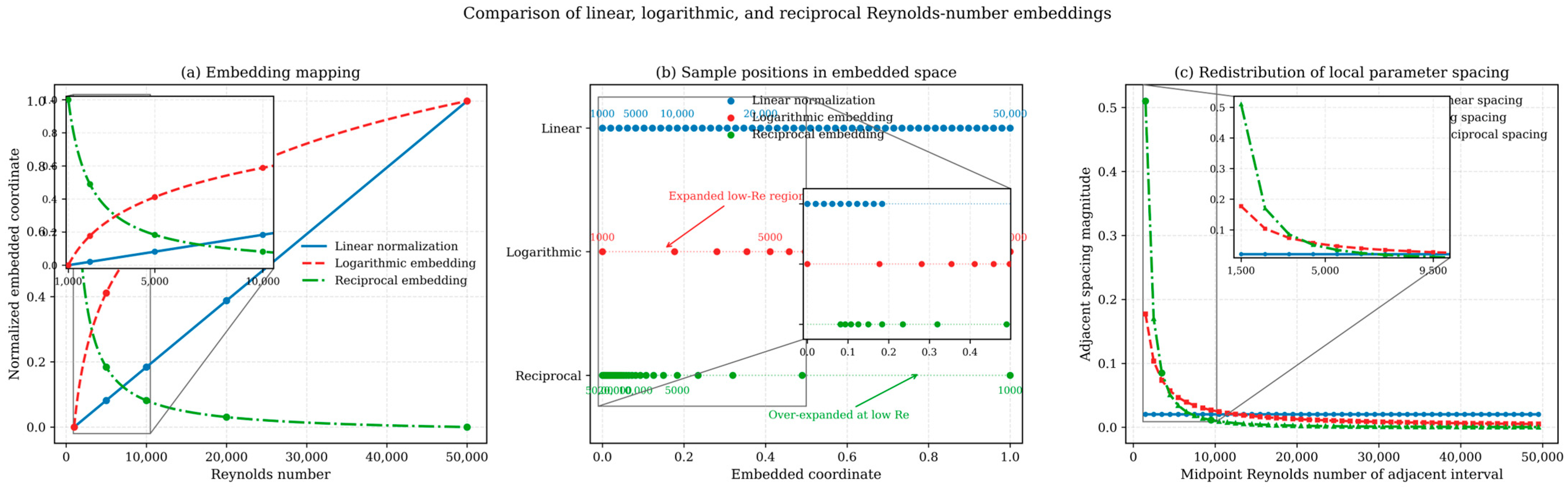- Logarithmic Embedding (D2): To alleviate this issue, the Reynolds number is transformed using a logarithmic embedding, , followed by min-max normalization before input to the network. This transformation does not simply make the samples redistribute more uniformly. Instead, it reshapes the conditioning variable by expanding the low-Re region and compressing the high-Re region in the embedded space. As shown in Figure 5, which visualizes the embedding mapping, the sample positions in the embedded space, and the spacing between neighboring Reynolds-number cases, the logarithmic embedding allocates higher parameter resolution to the low-Re range. The inset views further show that this redistribution is especially pronounced for . These observations suggest that the logarithmic embedding improves parameter-space conditioning by representing Reynolds-number variation in relative-scale terms rather than absolute numerical distance. This interpretation is consistent with the quantitative results. As shown in Figure 6, the logarithmic embedding reduces the Multi-Regime Mean Relative Error (MR-MRE) by 42% compared with linear scaling, suggesting that logarithmic Reynolds-number embedding is an effective parameterization strategy for unified multi-regime training in the present study.