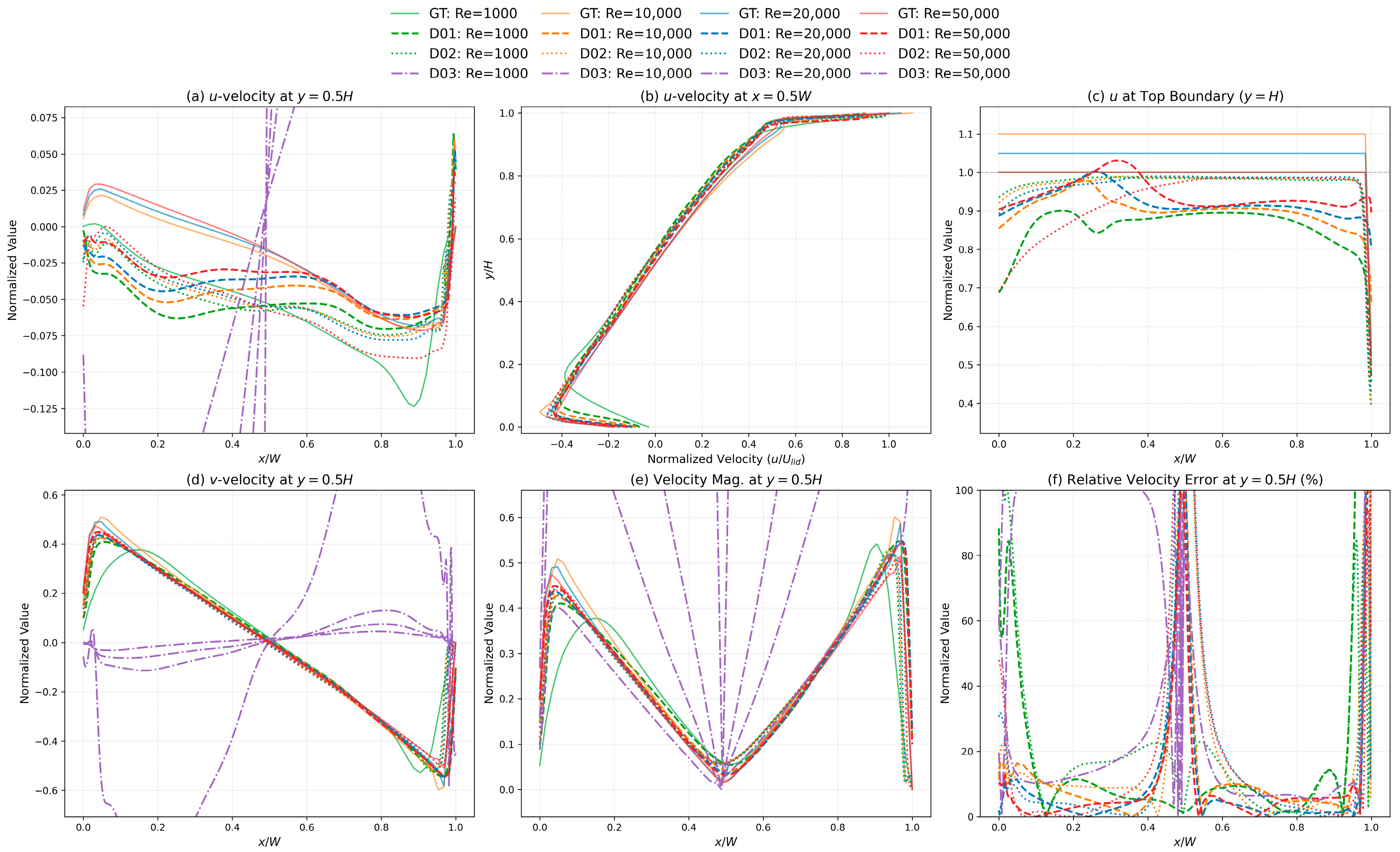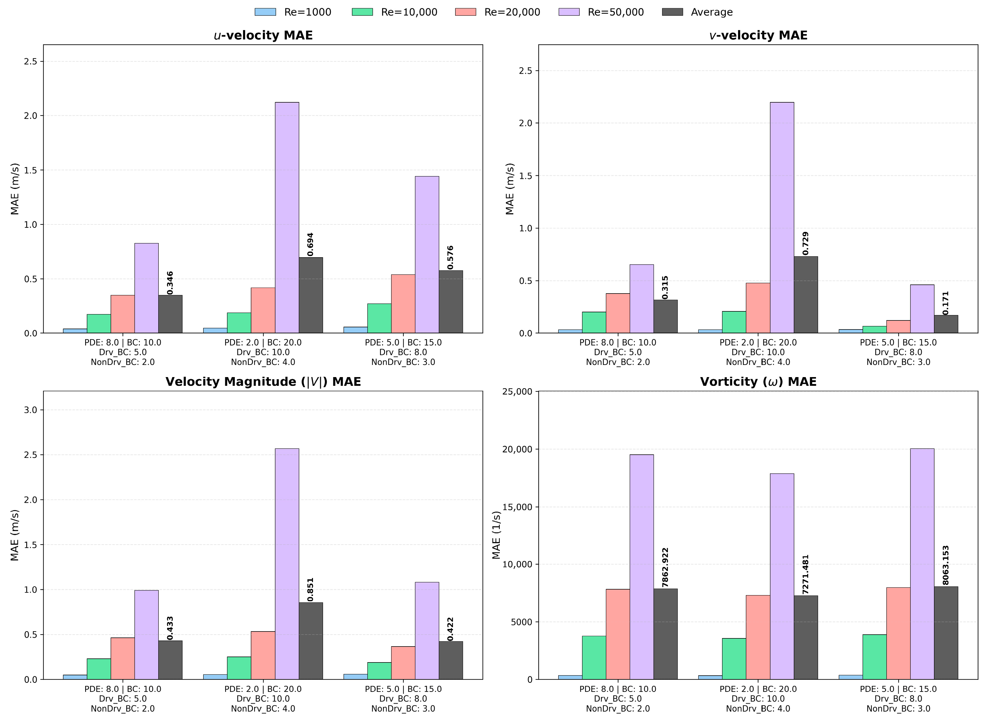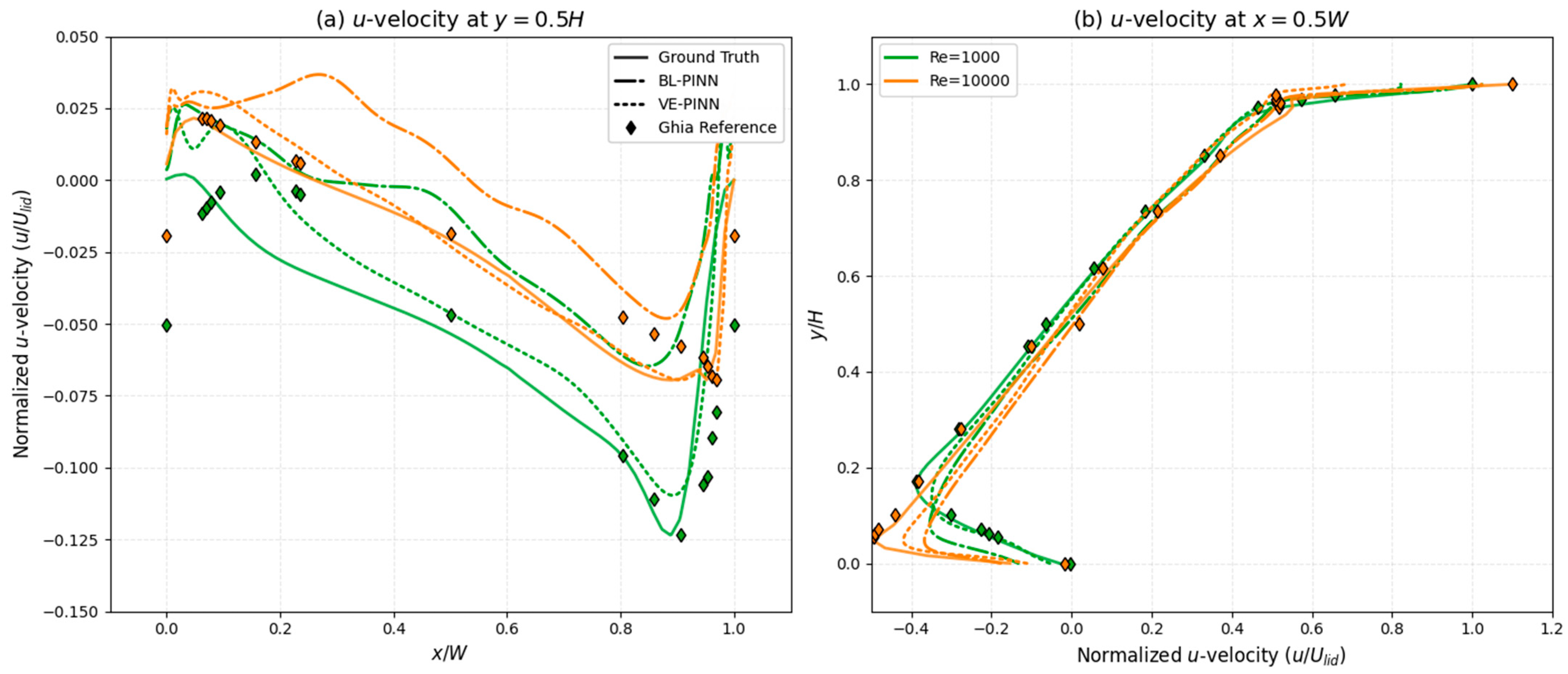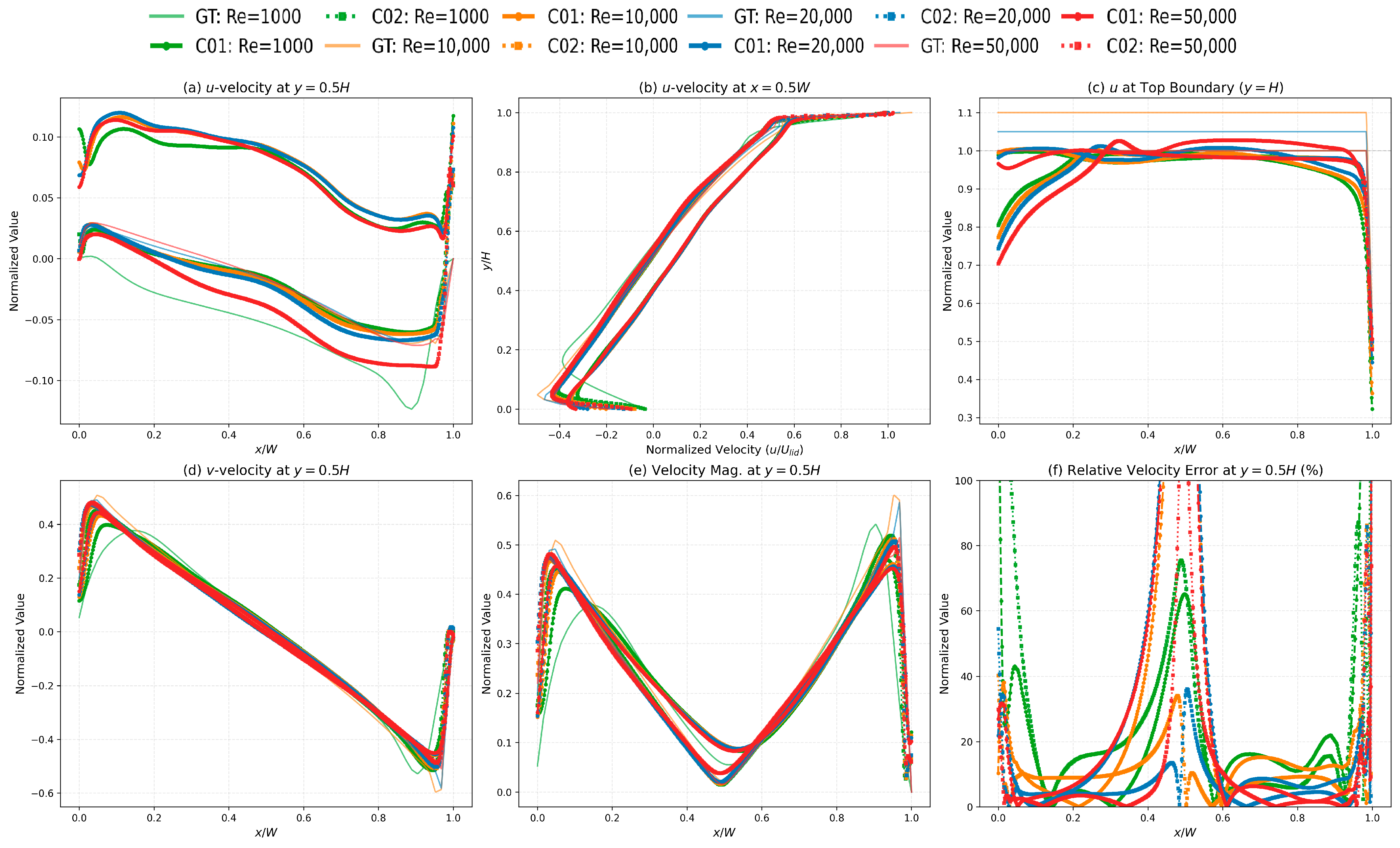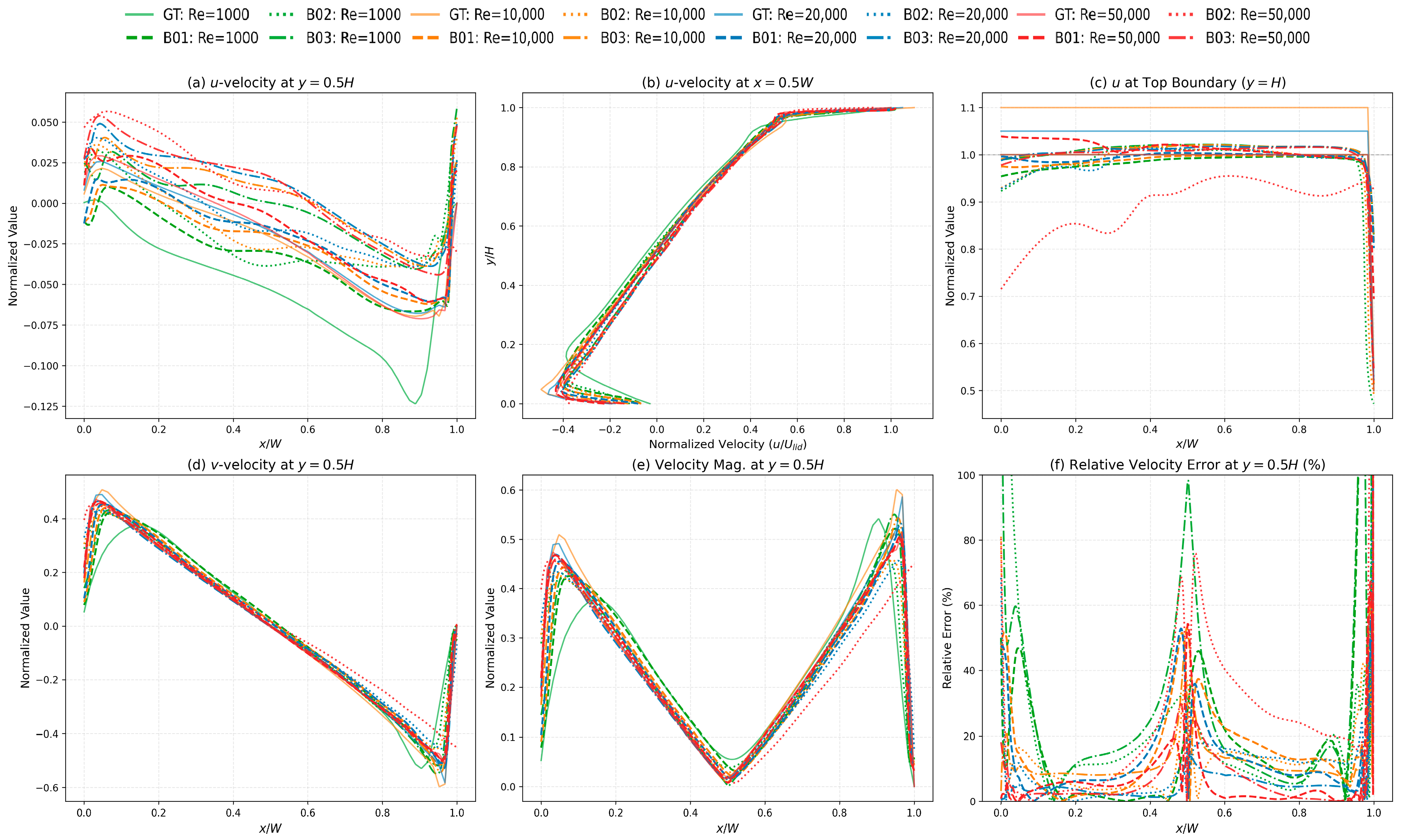 - Baseline Failure: Standard PINN often over-smooth these low-energy flow features, predicting near-zero velocity fields in the corner regions, thereby completely ignoring the existence of secondary vortices.