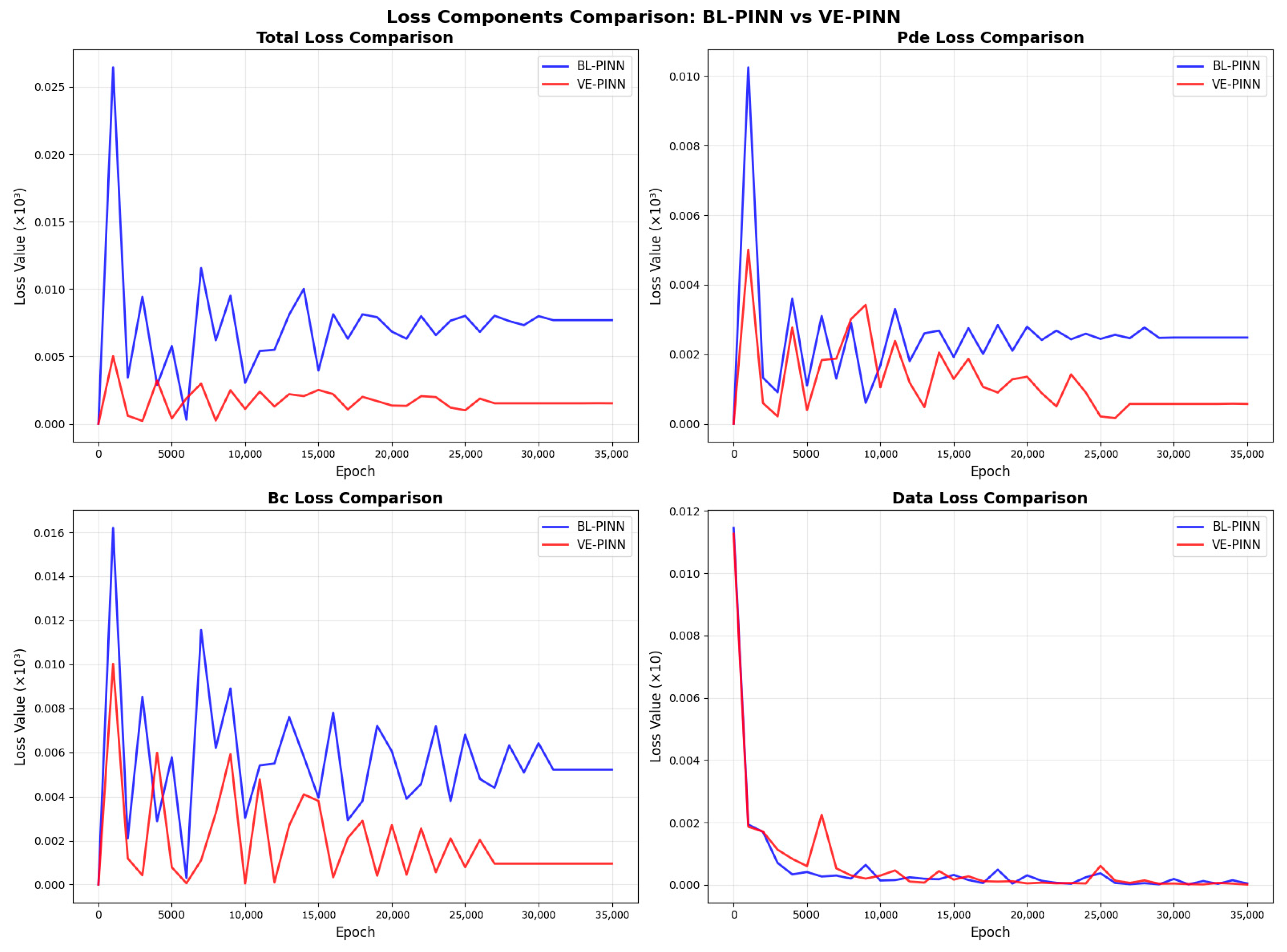 - Regarding training efficiency and robustness: Ko S et al. (2025) proposed the variable-scaling technique VS-PINN, which significantly improved the training efficiency and accuracy for stiff and nonlinear problems by analyzing the eigenvalues of the neural tangent kernel (NTK) [10]. Marcin Łoś et al. (2025) developed the Collocation-based Robust Variational Physics-Informed Neural Network (CRV-PINN), which enhanced model stability by constructing a robust loss function and is applicable to a broad class of partial differential equations [11]. Song Y et al. (2024) introduced LA-PINN, which, by incorporating a loss-attentional network, assigns different weights to errors at different training points, effectively improving convergence speed and approximation accuracy for hard-to-fit regions [12].