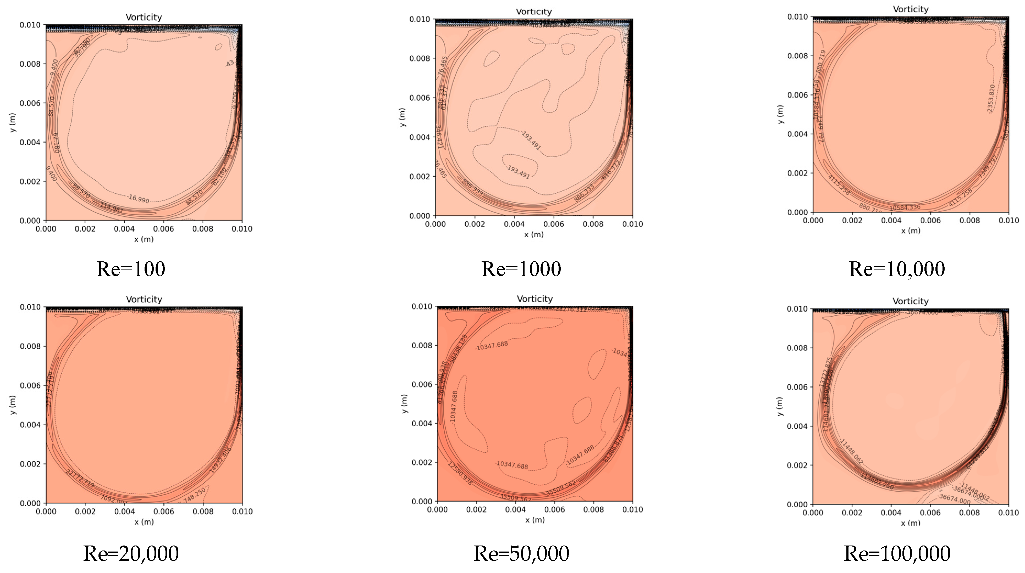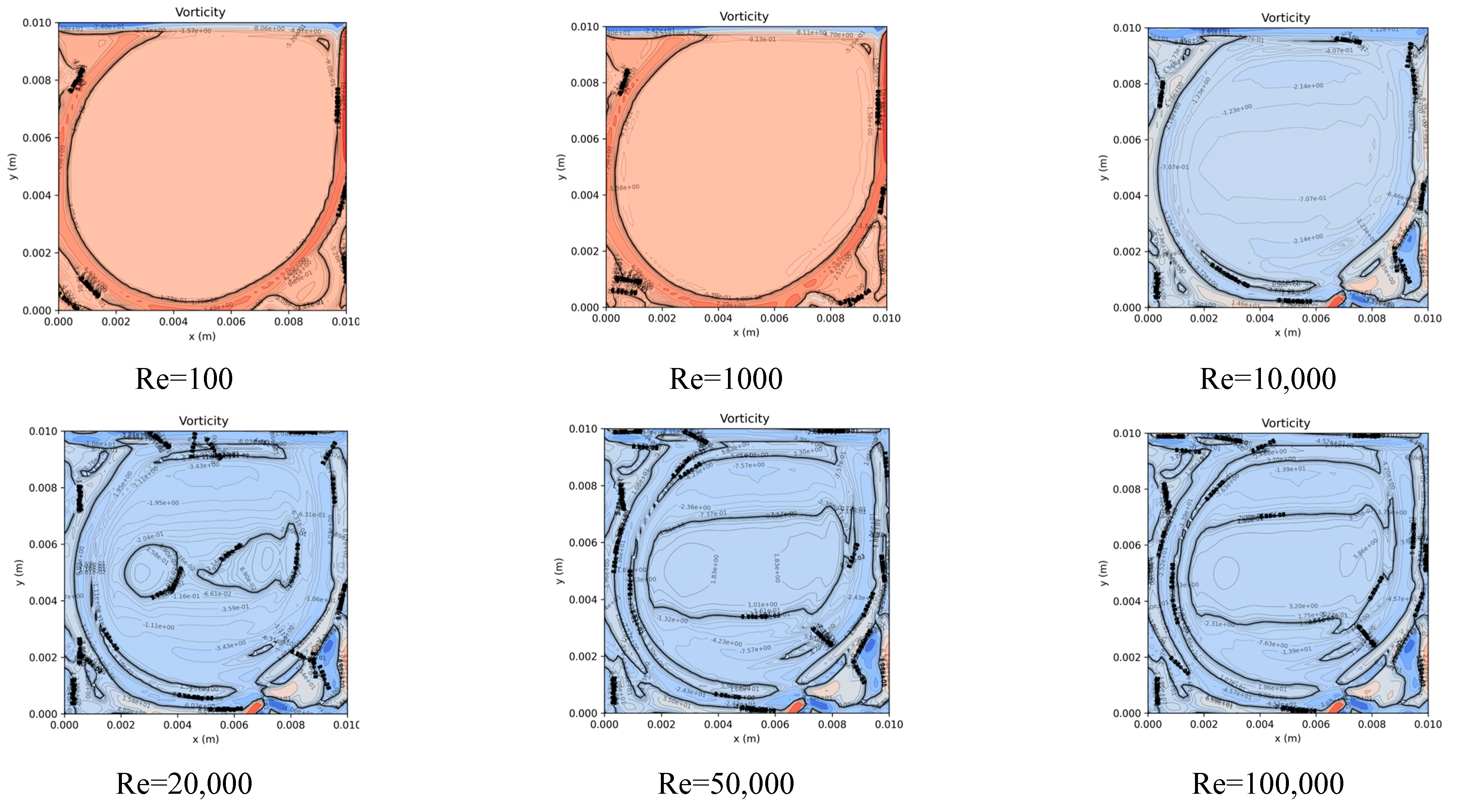 - Effective Capture by Enhanced Model: With the introduction of the vorticity transport constraint, the model successfully identifies and reconstructs the corner secondary vortices. Figure 12 and Figure 13 present the vorticity distribution results within the region . It can be observed that VE-PINN provides richer flow field details in its predictions of separation point locations and recirculation centers compared to BL-PINN. Without vorticity enhancement, as the top lid velocity increases, the gradients at the edges of the primary vortex structure become concentrated, and the corner secondary vortex structures experience dissipation, making them difficult to resolve and capture. From the VE-PINN predictions, as the Reynolds number increases, changes also occur within the primary vortex structure, which in turn leads to the generation of cascaded secondary vortex structures.