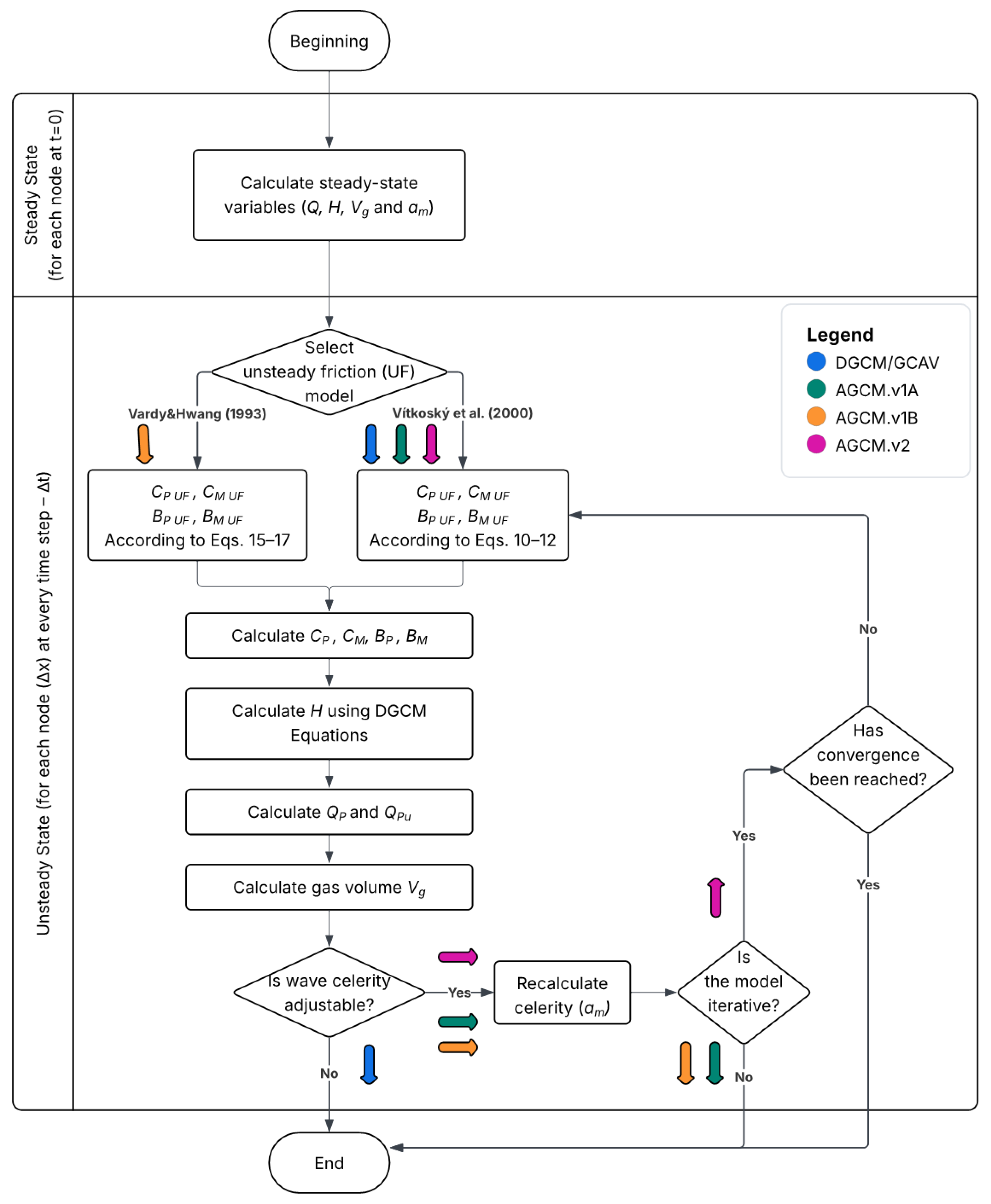 - AGCM.v2: Iterative extension of AGCM.v1A, featuring internal coupling between piezometric head, air volume, and wave celerity through a convergence loop at each time step.