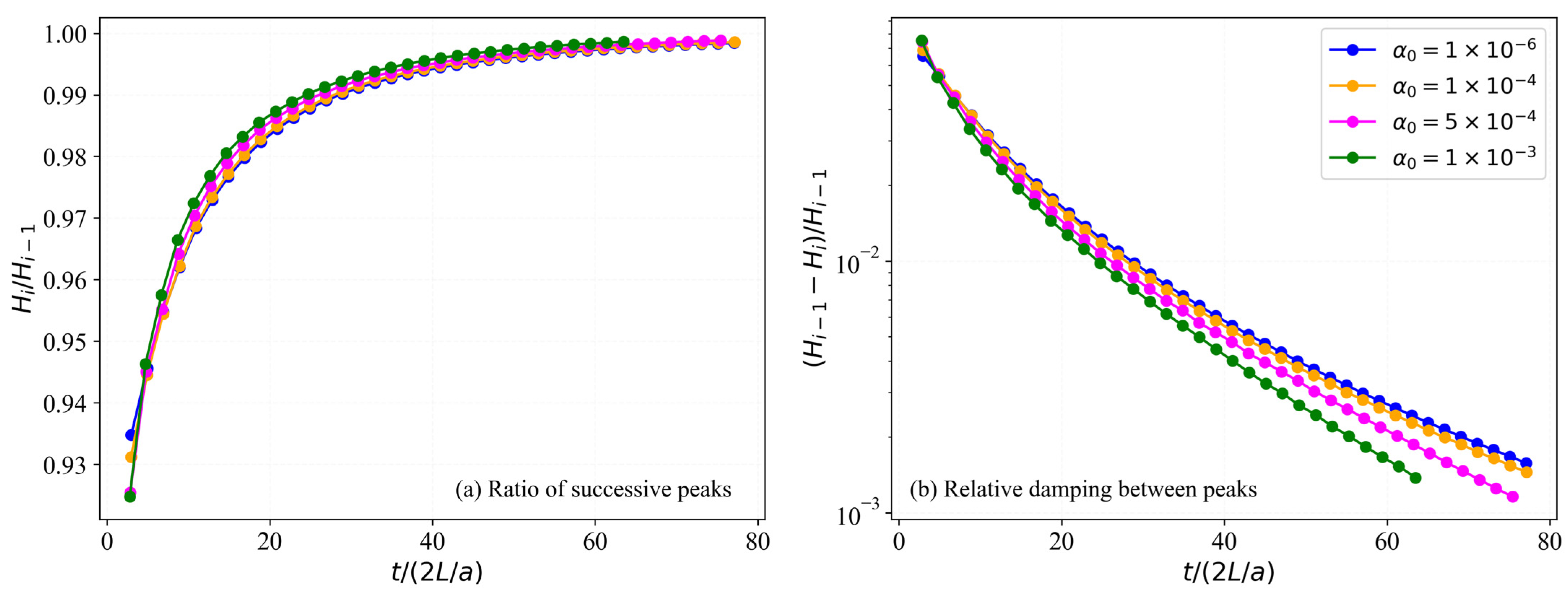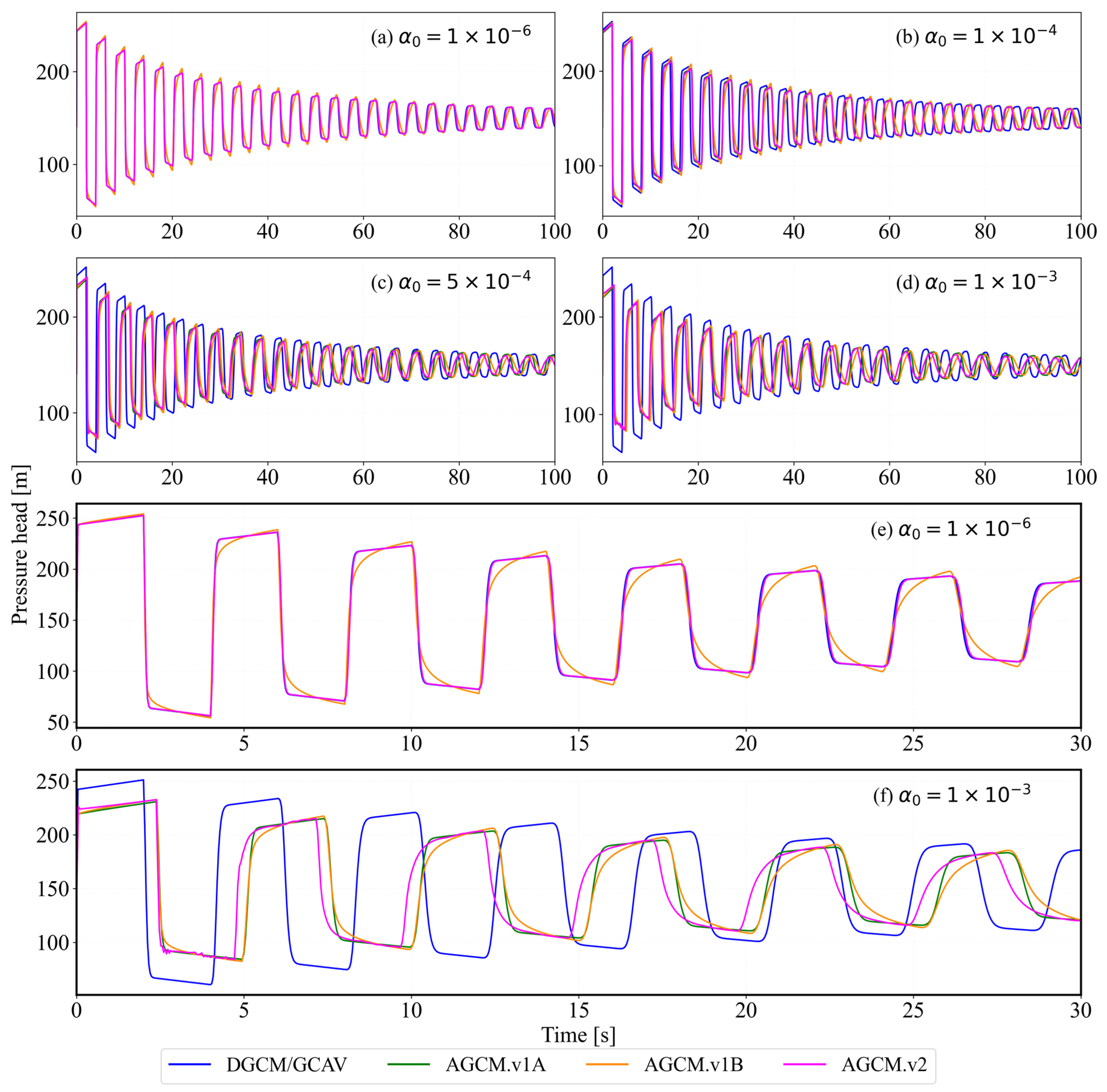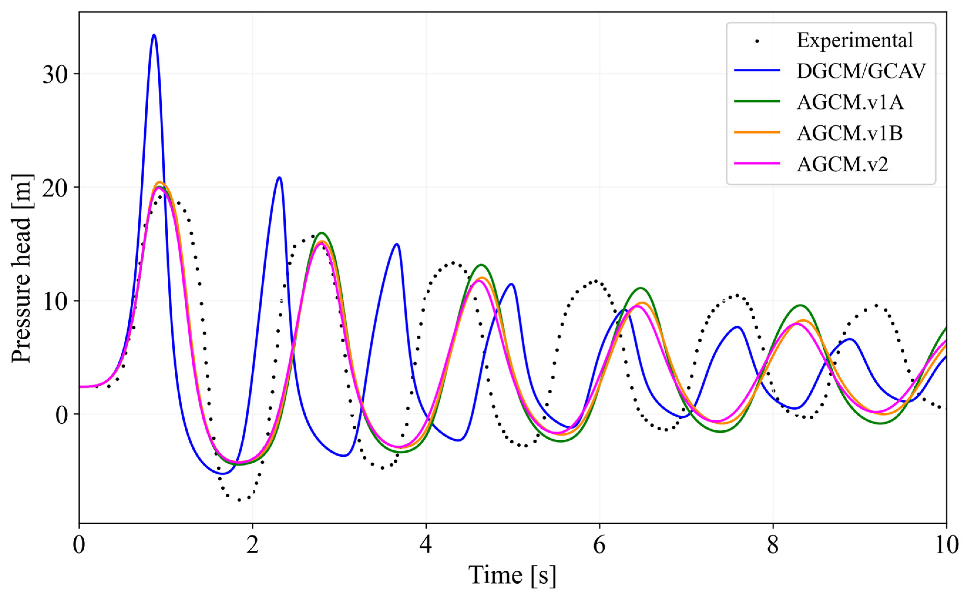 - AGCM.v2, which recalculates wave celerity and head within each time step as explained in Section 2.5, also shows close agreement with the AGCM.v1 at low gas fractions. However, as the gas content increases, systematic differences become more noticeable; particularly in terms of phase alignment, it diverged slightly. These differences are likely due to small differences in the converged values of celerity and at each node over time.