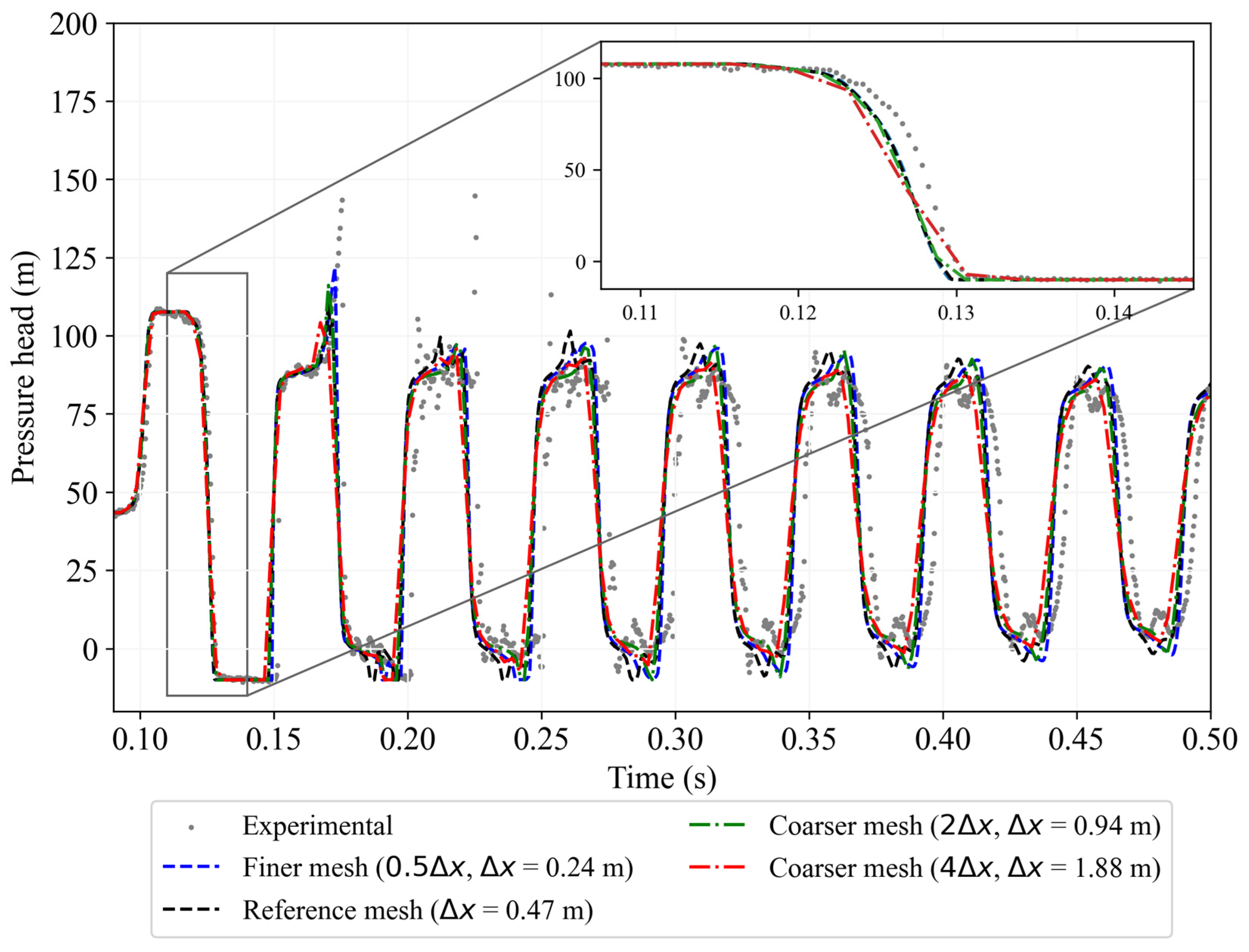 - Zhou, L.; Li, Y.; Karney, B.; Cheng, Y.; Liu, D. Godunov-Type Solutions for Transient Pipe Flow Implicitly Incorporating Brunone Unsteady Friction. J. Hydraul. Eng. 2021, 147, 04021021. [Google Scholar] [CrossRef]