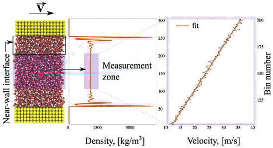 Averaged values of observables are measured in 300 horizontal bins of thickness 0.32 nm every to avoid redundancy, where the time-step is set to fs. The simulations are performed in a (canonical) NVT ensemble (a statistical mechanical ensemble with a fixed number of particles (N), volume (V), and system’s temperature (T)); the temperature of the system is maintained at T = 298 K via the Berendsen thermostat []. In order to avoid affecting the velocity calculations, the thermostat is applied only in the z-direction of the flow; the equipartition theorem ensures that each degree of freedom is close to the target temperature. In the equilibration stage, water density is obtained with a FADE controller []. After the desired system has developed, the density controller is switched off and the top wall is set to move at m/s until a steady-state is reached (high velocities reduce thermal fluctuations); the calculation of velocity takes place in the measurement-zone consisting of 100 bins. The applied shear stress is measured using the Irving–Kirkwood equation [].