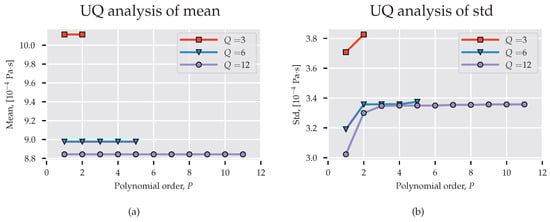 In the previously mentioned work on UQ in molecular dynamics and multi-scale simulation, it was claimed that low-order polynomials are sufficient to model parametric uncertainty. Rizzi et al. [] used quadrature nodes to compute the PC coefficients for density, enthalpy, and self-diffusivity of water with polynomials up to . Salloum et al. [] showed that an expansion order accurately quantifies the uncertainty in molecular dynamics calculation of water velocity. In our study, we consider three PC models of order with nodes, correspondingly. In Figure 3a,b we present, respectively, mean and standard deviation for spectral projections of increasing order. These pictures verify that a low-order basis is sufficient for determining the stochastic response of the system. Clearly, the first- and second-order statistics measured with and are comparable and do not vary significantly for . However, polynomials of order do not provide mean value close to the expected Pa·s (the value differs by approximately from the experimental result provided by Harris and Woolf [] and is within the error bounds of the TIP4P/2005 water model, []) obtained with the TIP4P/2005 water model and the standard deviation differs largely from the other estimations.