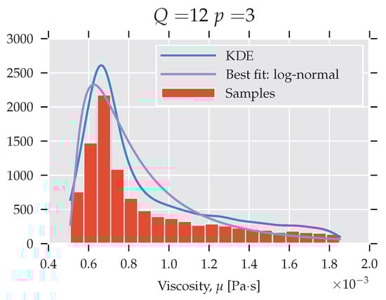 Subsequently, a third-order polynomial is used to obtain the histogram and kernel density estimates (KDE) describing the viscosity, η. Figure 4 presents the PDF that was obtained for and with a log-normal fit. Qualitatively similar histograms were obtained for other settings. The histogram exhibits high skewness: the bulk of the mass is situated just below the mean, and large values are vanishing relatively slowly (long tail). This shows that the viscosity estimate is sensitive to the LJ potential parameters. More specifically, a majority of the ϵ from the selected interval underestimates the viscosity, and a large fraction leads to a significant overestimate.