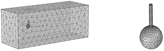 After the preliminary numerical tests, we perform our simulations of the ball and fiber immersed in a flow of water with the parameters described below. Based on the benchmark and convergence studies performed in the previous sections, we choose for the discretization of velocity elements and 48,493 mesh points for the algorithm. The system of Equations (1)–(3) are solved with the following boundary conditions: (i) the no-slip boundary conditions are imposed on all faces of the flow domain and on all boundaries of the ball and fiber; (ii) zero pressure conditions are held at the outlet; (iii) the sphere is fixed, while the fiber is free to bend; (iv) the tip of the fiber has an imposed boundary load given by