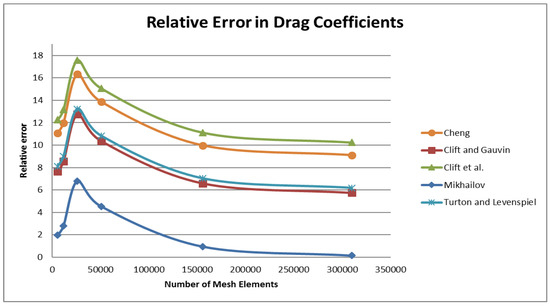 Relative error for drag coefficients for varying number of mesh elements computed using formulas in Cheng [24], Clift and Gauvin [26], Clift et al. [26], Mikhailov [27], Turton and Levenspiel [28].