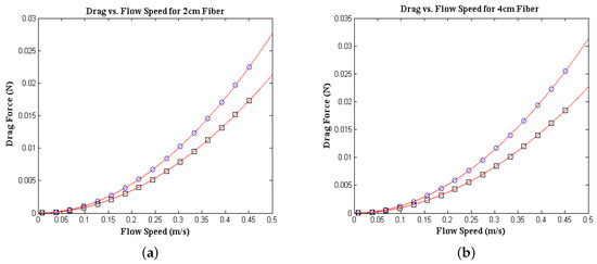 The graphs show the change in the drag force for fibers of lengths 2 and 4 cm respectively. We notice that an increase in fiber length leads to a significant increase in drag force. The red lines in the figure represent exponential least squares fits, i.e.,