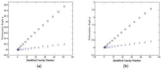 The φ Deformation is considered to be measured in the plane (up and down). These angles are measured for (a) and (b) configuration angles for fiber lengths of 2 cm (◇) and 4 cm (□).