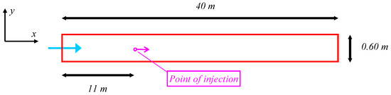 In the numerical study to solve the flow field, an approach based on the RANS equations was applied, where the closure problem was solved by the k-ε model [75]. The transport of a tracer was simulated by using Equation (7), as adapted for a 2D geometry, and steady-state conditions. The turbulent Schmidt number was assumed to be equal to one. These equations were solved using Multiphysics 3.4™, which is a commercial multiphysics modeling environment.