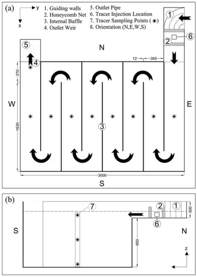 Schematic plan view of the solute transport case study: (a) a contact tank that features meandering flow as indicated by vectors; (b) cross-sectional view of the channel inlet and Compartment 1 (dimensions in mm).