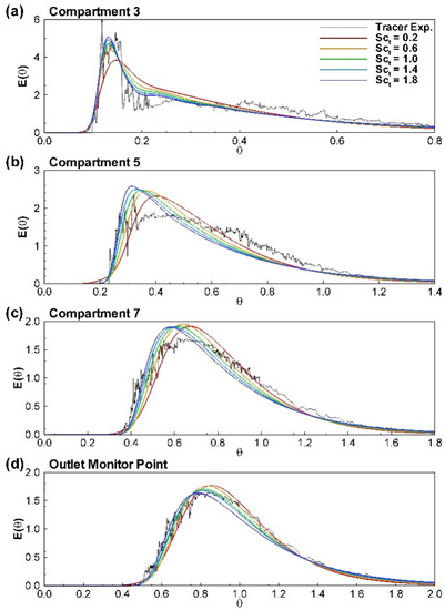 RANS simulations of the hydrodynamics in the tank were performed employing a finite-volume CFD model that operates on a structured orthogonal grid. A Semi-Implicit Method for Pressure-Linked Equations (SIMPLE) was applied to couple the pressure to the velocity field, and the standard k-ε turbulence closure was included. Once the simulation converged to a steady-state flow field, the transport of scalar quantities was simulated by solving the three-dimensional Reynolds-averaged advection-diffusion equation. More details of the numerical methods, computational model setup, grid independency and validation of the CFD approach are reported in [27,28]. In these, a Sct value of 0.7 (Table 5) was used following Launder’s suggestion [80], and the effect of Sct was not contemplated further. For this investigation, supplementary simulations were conducted, in which the Sct number was altered within the range of 0.2–1.8 in order to identify and quantify the significance of the parameter on the RTD curves and the corresponding Indicators of Hydraulic Efficiency (HEIs).