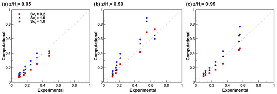 Later on, further numerical simulations were carried out to investigate how the parameterization of Sct affects the numerical results, which is the focus of the present paper (Table 4). As expected, values of Sct lower than one resulted in stronger lateral spreading of the tracer with a larger transverse variance and, according to Equation (9), in larger Dt-y. On the contrary, if it was assumed that Sct > 1.0, the turbulent transverse mixing coefficient tended to a lower value. For Sct = 1.3, Dt-y was very close to the experimental value.