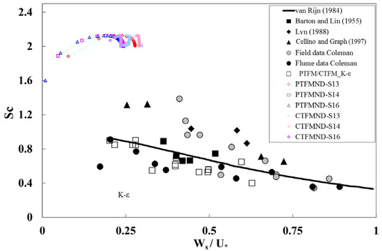Muste et al. [48] developed Particle Image Velocimetry-Particle Tracking Velocimetry (PIV-PTV) measurements to study the interaction between suspended particles and flow turbulent structures. They compared the traditional mixed-flow approach to sediment-laden flows that treats these flows essentially as flow of a single fluid, with a two-phase flow perspective. Two sets of experiments were conducted: one set with Natural Sand (NS) and the other set with Neutrally-Buoyant Sediment formed of crushed nylon (NBS). From the experimental data, they obtained values of the ratio between sediment to momentum diffusion coefficients quite different for the two datasets. The calculated Sct values were much larger than one, namely from 1.4 to 2.11, for the NS flows, and much smaller than one, namely from 0.22 to 0.52, for the NBS flows.