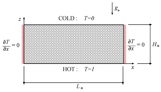 A narrow () rectangular fluid-saturated porous domain subject to gravity and heated from below, as presented in Figure 1, is considered.