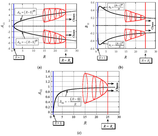 Therefore, the convective fixed points lose stability in the linear sense at a value of the scaled Rayleigh number ( for ) and the basic frequency of the oscillations at marginal stability is . Their values are presented in Equation (34). For the convective fixed points are stable (spiral nodes) and the solution will produce steady convection. At the saddle limit cycle presented in Figure 2 collides with these steady convective fixed points and is annihilated by this collision. For the fixed points are not stable and another type of solution (chaotic) is anticipated. Note that in order to obtain finite positive values for and from (34) their denominator must be positive, implying .