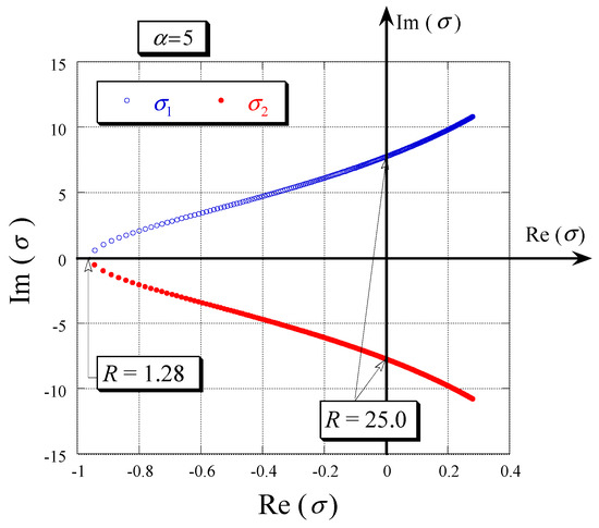 It may be observed again that despite the fact that the gain controller appeared explicitly in the Jacobian matrix, its effect disappeared (cancelled out) from its determinant and is not reflected in the eigenvalue equation. Furthermore, Equation (29) is identical to the one obtained for the uncontrolled Lorenz system (corresponding to ) as presented by Vadasz and Olek [8,11]. The eigenvalues are therefore identical to the ones obtained from the uncontrolled system. Equation (29) yields three eigenvalues. Substituting the general form of an eigenvalue as , where and are the real and imaginary components, respectively, into Equation (29) and separating real and imaginary parts yields two equations for the real and imaginary components of the eigenvalues in the form