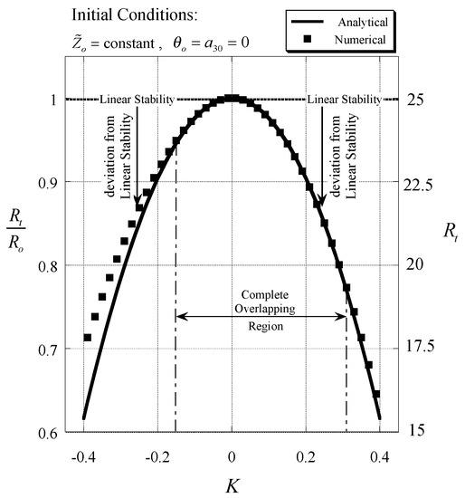Initially the uncontrolled system analytical solutions were compared to the numerical ones obtained for different initial conditions and the transition value of was established numerically by trial and error, and compared to the one obtained analytically from Equation (48). The computations were divided in three computational sets of results. Computational set 1 corresponds to the particular case when and (presented by Vadasz [12]), computational set 2 corresponds to the particular case when , associated with Equations (49)–(51), while computational set 3 corresponds to arbitrary initial conditions that do not belong to any particular case and are therefore general. The results are presented in Figure 6 where the continuous curve represents the analytical solution expressed by Equation (48) while the different dots represent the computational results corresponding to the different computational sets. The very good agreement between the analytical and numerical solutions in the neighborhood of the convective fixed point (i.e., ) is evident from Figure 6. Actually for the numerical and analytical solutions overlap. When considering the condition of validity of the asymptotic expansion, i.e., , the agreement between the results is well within this anticipated domain.