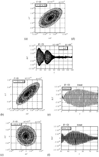 We evaluate therefore the differences between the computational and numerical solutions, and at providing the results presented in Figure 11a–c in terms of projections of trajectories data points on the planes , and , where the data points are not connected. A value of was used in the computational solution, and a value of the tolerance control parameter was used in the numerical solution for the results presented in Figure 11. It can be observed from the figures that the maximum difference between the two solutions is of the order of magnitude of . At this stage we were interested to establish the reason for the greater difference between the solutions as compared with the results obtained at subcritical conditions, i.e., for , and in particular we attempted to establish which one of the solutions, the computational or the numerical is to be “blamed” for increasing the difference between the two from at to at . In order to establish this we evaluated the differences between two consecutive computational solutions corresponding to and , respectively, and two consecutive numerical solutions corresponding to and , respectively. The differences between the two computational solutions showed that the maximum difference in the computational solution is of the order of magnitude while the maximum difference in the numerical solution is of the order of magnitude . We can therefore establish that the computational solution is more accurate in this case (i.e., its level of accuracy is saturated) and the “blame” for the loss of accuracy is to be placed on the numerical solution. Naturally, one can improve the accuracy of the numerical method by adopting a constant rather than variable time step algorithm, which is less efficient computationally, or by choosing a higher order Runge-Kutta scheme. Nevertheless, the comparison offered here is related to a standard library package (IMSL DIVPRK [3]) that is likely to be widely used. In this context, the comparison shows that when the standard library package tolerance parameter is taken to its limit (no more tightening of tolerance is possible beyond ), the computational solution outperforms the numerical one. Furthermore, even when we decrease the number of terms in the series to 10 the computational results remain the same up to the whole range of digits of machine precision. Therefore, the computational results are more accurate than the presently used numerical ones corresponding to their smallest possible tolerance, even with only 10 terms in the series. The reason for the latter is that the accuracy of the computational solution with 10 terms in the series is saturated. Reducing further the number of terms in the series decreases the accuracy of the computational results.