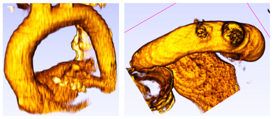 The anatomic model was derived from the CT scan of the three patients. 3D volumes of the thoracic aorta were generated using the commercial software COMSOL Multiphysics 4.3.b (COMSOL Inc., Burlington, MA, USA). The hemodynamic analysis included four steps: (i) the aorta vessel geometry of the patients; (ii) the 3D image data in digital imaging and communications in medicine (DICOM) format was reconstructed into 3D anatomic geometry using the medical open source imaging software 3D Slicer 4.6.2.; (iii) the 3D patient-specific geometries were extracted in the numerical domain (stereolithography (STL) format); and (iv) the numerical domain was meshed and simulations were performed on the CFD COMSOL-Multiphysics 4.3.b model. To verify the specific differences of aorta pathologies (Figure 6 and Figure 7) compared to the typical arrangement, an aortic root from a healthy patient (i.e., without aortic pathology) was also generated (Figure 8).