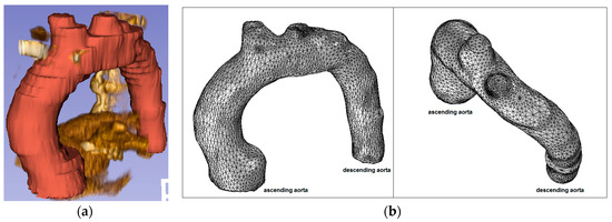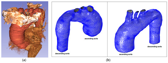 Ascending aorta aneurysm (Patient 1): (a) computed tomography (CT) data and segmentation; and (b) mesh.