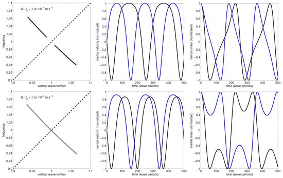 Solutions for the two high frequency members of the triad. Upper panels: m s. Lower panels: m s. Left panels: vertical wavenumber vs. frequency. In the high amplitude cases the two wave trajectories can not be distinguished and the lower frequency of that duo is over plotted as a thinner white line. Normalization of vertical wavenumber and frequency is provided by dividing the wavenumber-frequency pairs by the mean values for the two triads at . The dashed line represents the resonance curve. Middle Panels: black and blue traces represent the inertial velocity following the ray path, normalized by U. Right Panels: Similarly, black and blue traces represent the inertial shear following the ray path, normalized by . In the low(er) amplitude case all phases of the background are sampled by the test wave. The high(er) amplitude case represents a resonant bound wave phenomena.