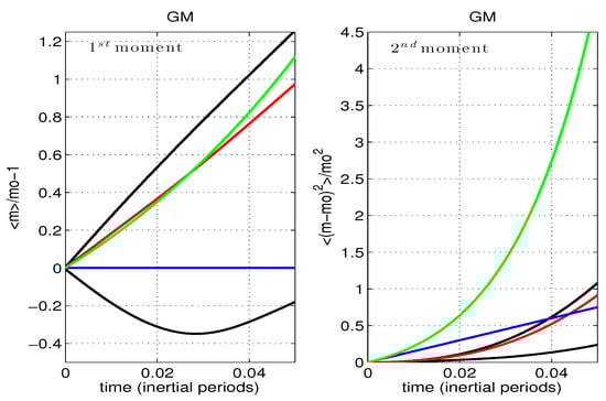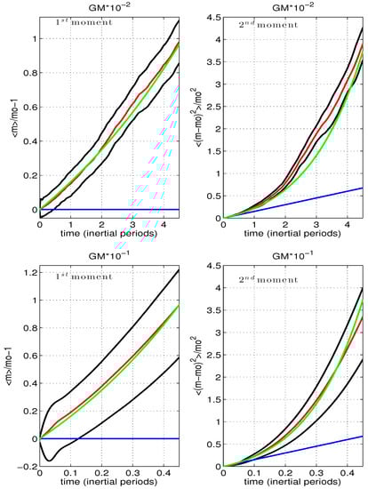 The time integration at oceanic amplitudes is limited by test waves reaching the boundaries of the spectral domain, but even so, one should be able to appreciate that the second moment shows little sign of rebounding to the prediction ensconced in the time dependent Taylor Formula (19). This inference is supported by ray tracing simulations (not reported) that use a higher stratification N which, in turn, permits increased integration times.