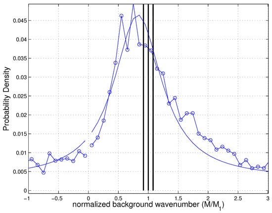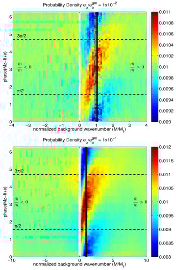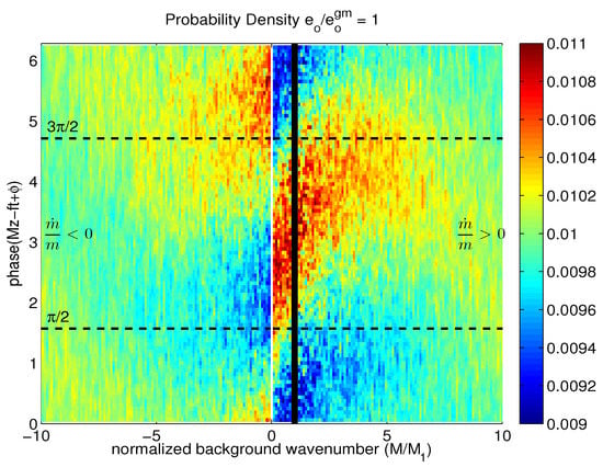 In ray tracing, phase locking can be much more directly assessed (Figure 6). In this high dimensional system, the probability density of background phase (20) is estimated as a function of background wavenumber :
