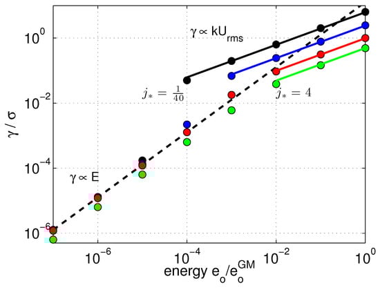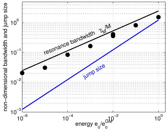 Bandwidth estimates versus spectral level, normalized by frequency . The dashed black line is the small amplitude limit of (42). Colors differentiate estimates using different values of the GM76 bandwidth parameter = [1/40 1/6 1 4] m as [black blue red green]. The background spectra differ in total kinetic energy and Doppler shift but have the same asymptotic shear spectral density at high vertical wavenumber. The dots indicate numerical estimates using (42). The green dots lie below the others as the GM value of m challenges the assumption of a constant shear spectral density. The scaling regime of is indicated by the solid lines connecting the numerical estimates. The ray tracing results reported here use a background with . The transition in bandwidth scaling for the DIA equations happens at far smaller amplitudes () than the transition noted in the ray-tracing results ().