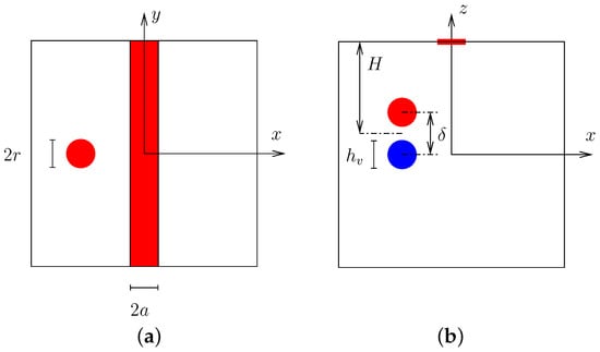 A few cross sections of at constant z are illustrated in Figure 2 for a filament with half-width . The flow at the surface , denoted , is shown in Figure 2a, while the flow at the depths of the upper and lower vortices comprising the heton, denoted and respectively, is shown in Figure 2b (as the black and red curves). We now examine how the heton moves in such a flow field. For purposes of illustration, we assign a strength to vortex 1 and to vortex 2. We place the vortices initially at and . In this aligned configuration at , the self-induced velocity of the heton is zero. Subsequently, the vortices separate in y since the filament induces a velocity in the y direction only, and is greater in magnitude than . The offset of the vortices in y subsequently generates a self-induced motion of the heton in the x direction. By symmetry, the x velocity component is the same for both vortices, so for all time. No self-induced motion is ever generated in the y direction. We conclude that the vortices move in y only due to the presence of the filament, and in x only due to their mutual interaction. This is in contrast with the drift.