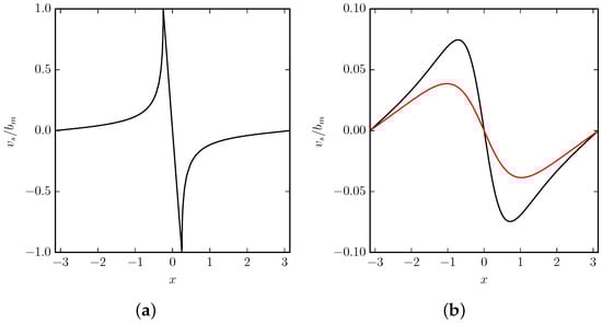 Dimensionless velocity profiles associated with an undisturbed surface buoyancy filament of half-width . (a) surface flow at ; (b) flows at the depths of the upper vortex (, black curve) and the lower vortex (, red curve).