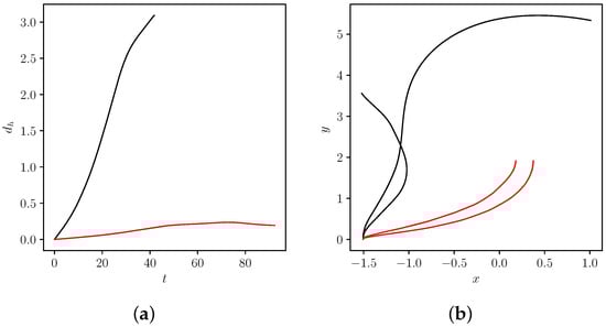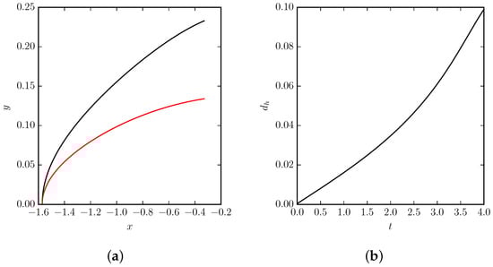 (a) trajectories of two point vortices with , and predicted by the simplified model for a fixed filament with and . Vortex 1 is shown by the black curve while vortex 2 is shown by the red curve; (b) horizontal distance between the vortices versus time t.