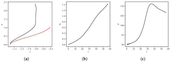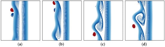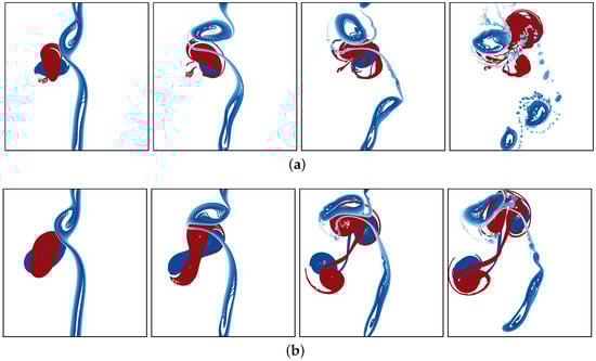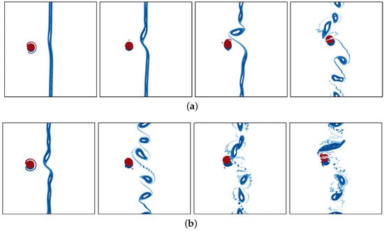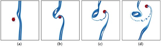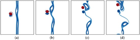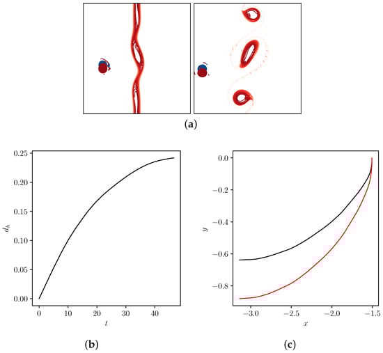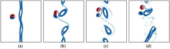 In the next example, case 4, the strength of the filament is weakened compared to that of the vortices, here by reducing ten-fold, from to . Results are presented in Figure 12. In this case, the much weaker vertical shear induced by the filament leads to only a small horizontal offset of the vortices. This slows their mutual propagation speed and keeps them tightly coupled, as shown by the diagnostics in Figure 13. Compared to previous cases, is an order of magnitude smaller. This is expected since the velocity difference is proportional to the strength of the filament. The small offset is nonetheless sufficient to enable to heton to propagate toward the filament, albeit on a much longer timescale. Along the way, the heton is deflected by the large billow formation occurring on the filament, induced by the arriving heton. This rotates the direction of propagation of the heton by more than , and causes it to reverse direction but not before it has crossed below the original location of the filament. Notably, as the heton passes below the filament, it traps part of it and extends the trailing filament, which then is even more unstable [23,32]. This results in the formation of a string of small but intense billows trailing behind the heton.