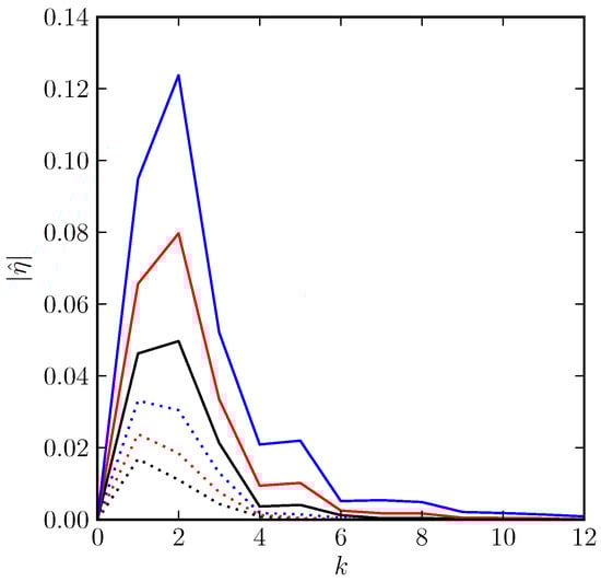 Case 1: magnitude of the Fourier modes of deformation of the buoyancy filament at (dotted black), (dotted red), 15 (dotted blue), (solid black), 20 (solid red), (solid blue). The modes are obtained by expressing the displacement of each buoyancy contour from its initial position as a Fourier series in y. The magnitude for each k is defined as the r.m.s. value of over all contours.