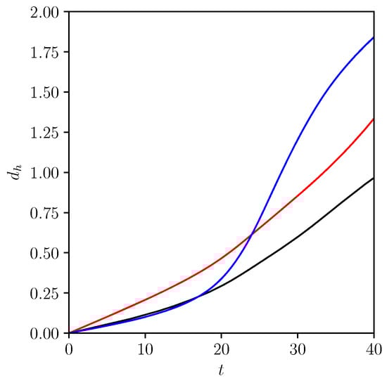 Results for the case , where is doubled relative to case 1 while keeping all other parameters the same, are presented in Figure 8. The main difference is that here the vortices of the heton separate more rapidly, as anticipated. The time evolution of is presented in Figure 9 and compared to case 1 (red and black curves). The wider separation initially speeds up the vortices until this is compensated by the growth in three dimensional distance d. The net effect is that the dipole approaches the filament more slowly in this case.