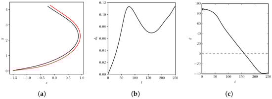 Case 4: trajectories of the vortex centres (vortex 1 in black, vortex 2 in red); horizontal distance between the vortex centres versus time t; and angle between the axis joining the vortices centres and the x axis.