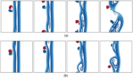 These results are shown in Figure 16. Due to the relatively large size of the heton compared to the width of the filament, the heton induces a relatively long wave perturbation on the filament, triggering first a single billow followed by a series of secondary billows. The billows are more regular in case since the filament here is twice as intense. The appearance of approximately five billows is one less than expected from the linear stability analysis of a strip in isolation [23]. A monochromatic wave with wavenumber (corresponding to ) has a growth rate , while wavenumber (corresponding to ) has a slightly large growth rate, . The fact that five billows are formed instead of six can be attributed to scale-selective and time-dependent perturbations induced by the heton.