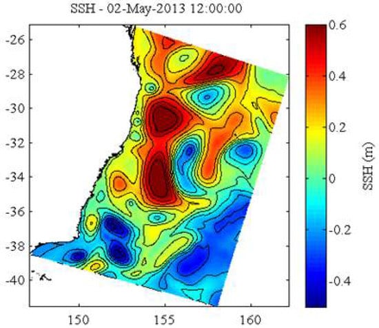 Altimetric map showing the interaction of eddies near the east coast of Australia; notice the close interaction of two anticyclones near the coast (Archiving, Validation and Interpretation of Satellite Oceanographic Data altimetry).