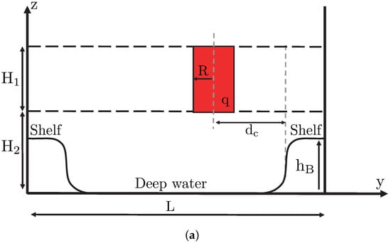 The interaction of a single vortex with a topographic step has already been studied. McDonald [27] showed that cyclones are drawn towards the shallow region (also called “the shelf” hereafter) and that anticyclones are repelled away from it, into the deep region. Indeed, a cyclone (referred to as a “primary cyclone” hereafter) advects fluid from offshore onto the shelf to its right and shelf fluid offshore to its left. The former fluid column is squeezed vertically and develops anticyclonic relative vorticity, while the latter is stretched vertically and becomes cyclonic. These fluid columns, which have acquired vorticity, are called “secondary vortices”. The flow field created by this secondary dipole advects the primary cyclone shoreward (see also Figure 2a of [28]). The opposite effect holds for anticyclones, which are advected offshore by these secondary vortices. Dunn et al. (2001) [29] showed that, for a tall topographic step, vortices can drift with the topographic wave in a steady motion. Zhang et al. (2011) [30] also studied the transport of shelf water, associated with the topographic wave-vortex interaction. They found that the topographic vortex created by a cyclone remains near the shelf, while that created by an anticyclone couples with it and moves offshore; therefore anticyclones are more capable of advecting water away from the shelf. It has been shown that the interaction of ocean vortices with the bottom slope can produce smaller (submesoscale) vortices by forcing and then destabilising a bottom boundary layer [31,32].