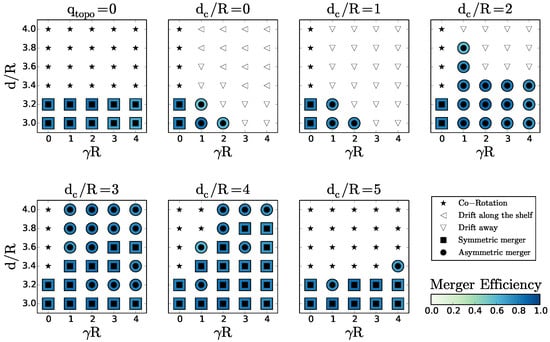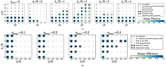 Regime diagram for the interaction of two surface cyclones with: (a) given (see above each plot) in the plane for ; (b) given topographic vorticity (see above each plot) in the plane. Black stars indicate co-rotation; white stars represent co-rotation and drift along the shelf/slope; black squares indicate symmetric merger; black circles represent asymmetric merger; white circles denote asymmetric merger and vortex splitting; upward pointing triangles represent drift towards and on the slope and shelf; and triangles pointing left represent drift along the shelf/slope. The blue shading provides the value of the merger efficiency, when relevant.